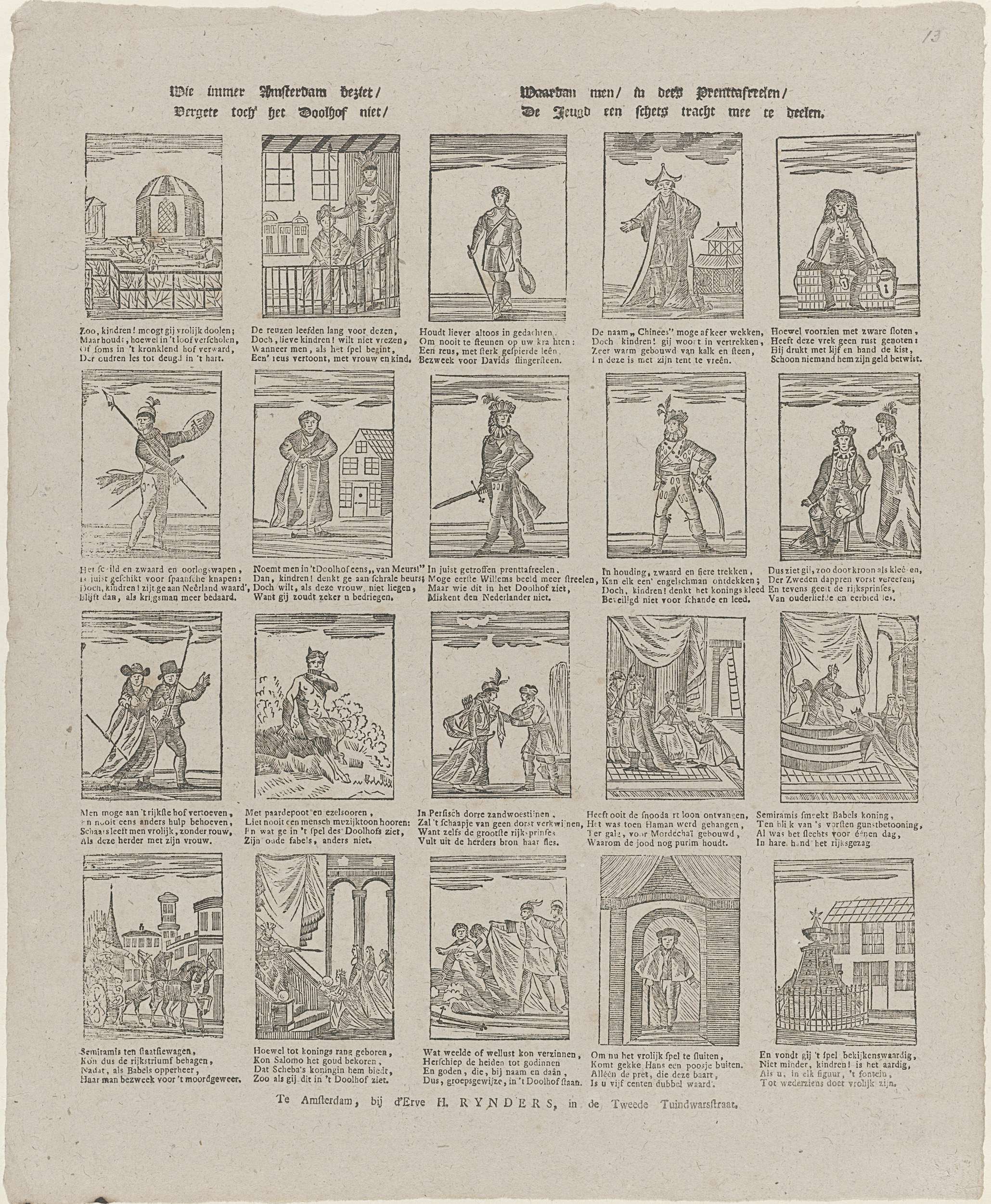 Blad met 20 voorstellingen van de Amsterdamse 'Oude Doolhof' op de Prinsengracht, en verschillende figuren zoals een Chinees, een herder en een herderin. Onder elke afbeelding een vierregelig vers.