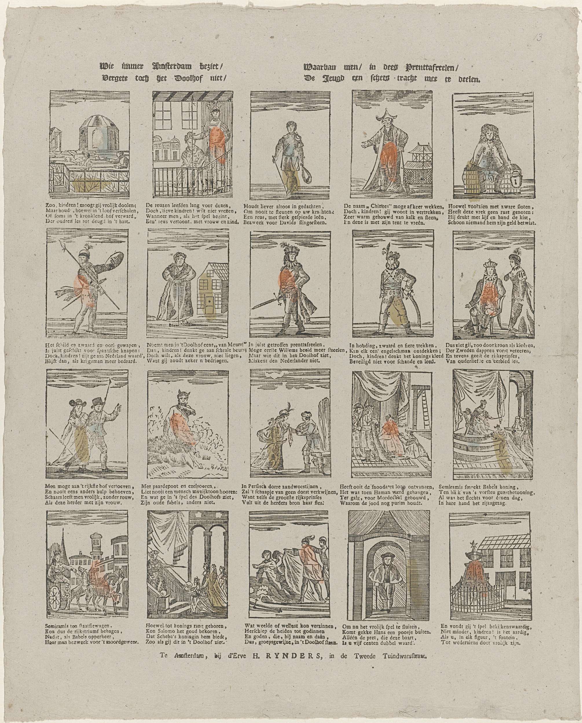 Blad met 20 voorstellingen van de Amsterdamse 'Oude Doolhof' op de Prinsengracht, en verschillende figuren zoals een Chinees, een herder en een herderin. Onder elke afbeelding een vierregelig vers.