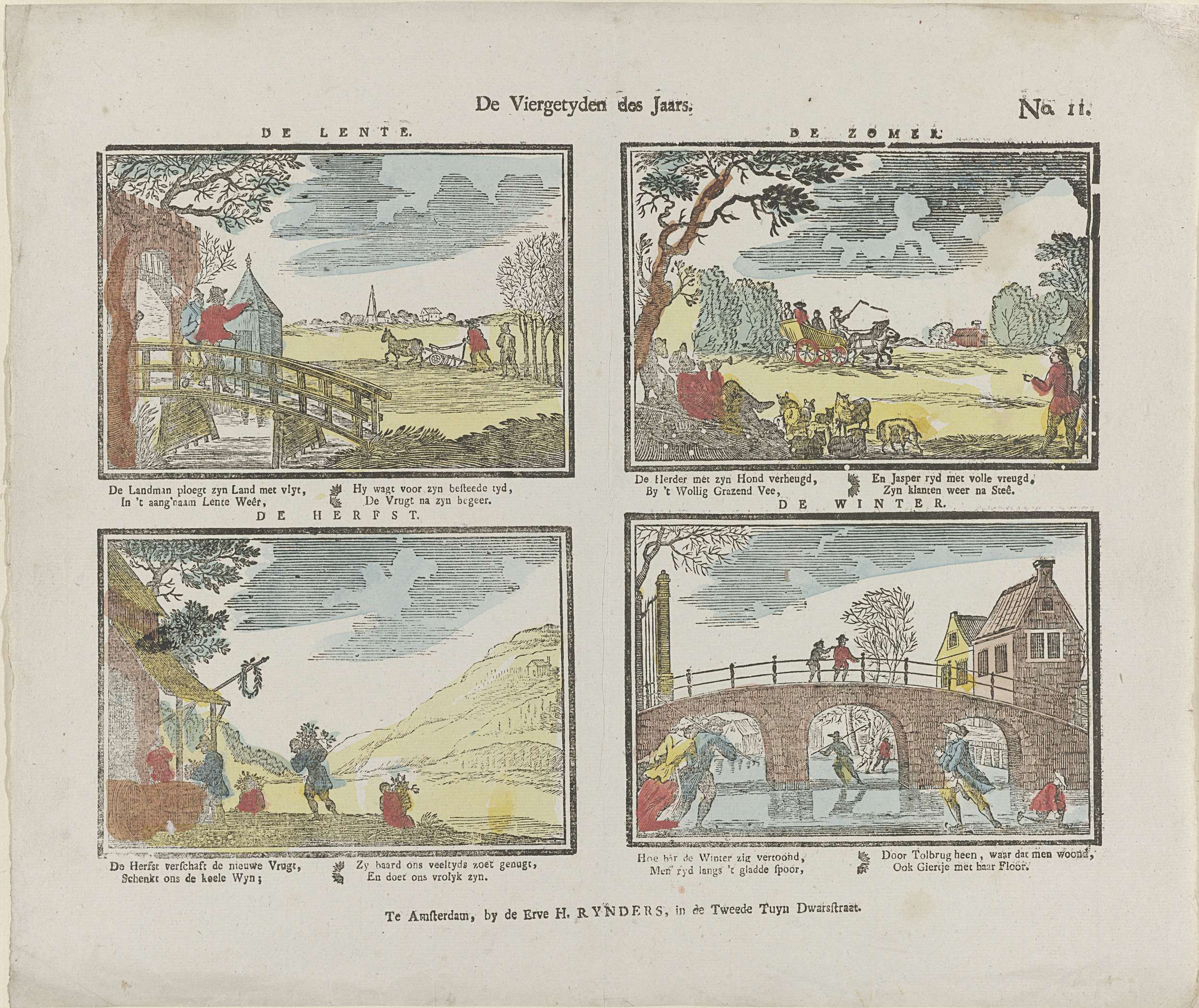 Blad met 4 voorstellingen van de vier jaargetijden en bijbehorende activiteiten. Onder elke afbeelding een vierregelig vers in twee kolommen. Genummerd rechtsboven: No. 11.
