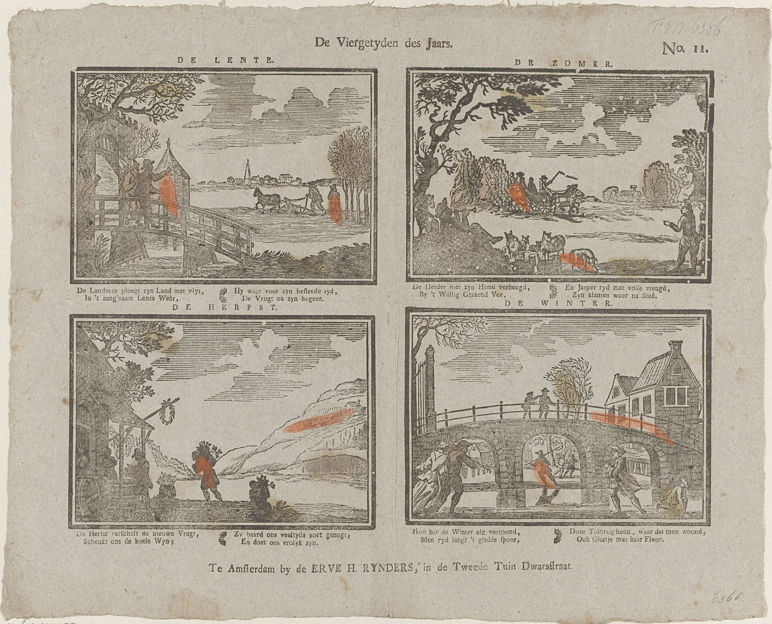 Blad met 4 voorstellingen van de vier jaargetijden en bijbehorende activiteiten. Onder elke afbeelding een vierregelig vers in twee kolommen. Genummerd rechtsboven: No. 11.