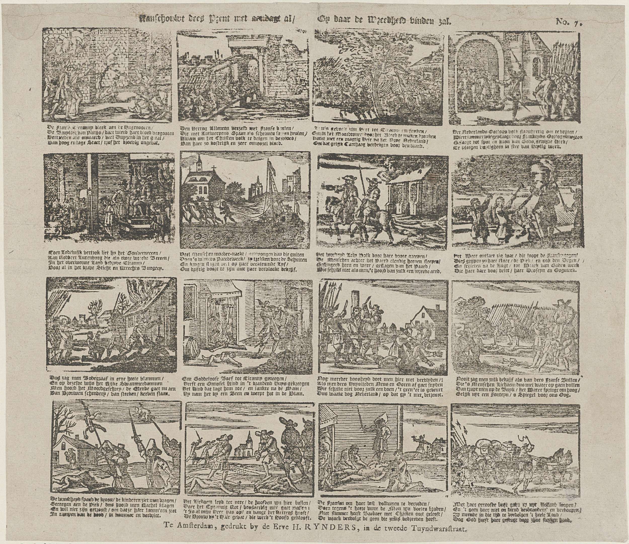 Blad met 16 voorstellingen van de Franse tyrannie. Onder elke voorstelling een vierregelig vers. Genummerd rechtsboven: No. 7.