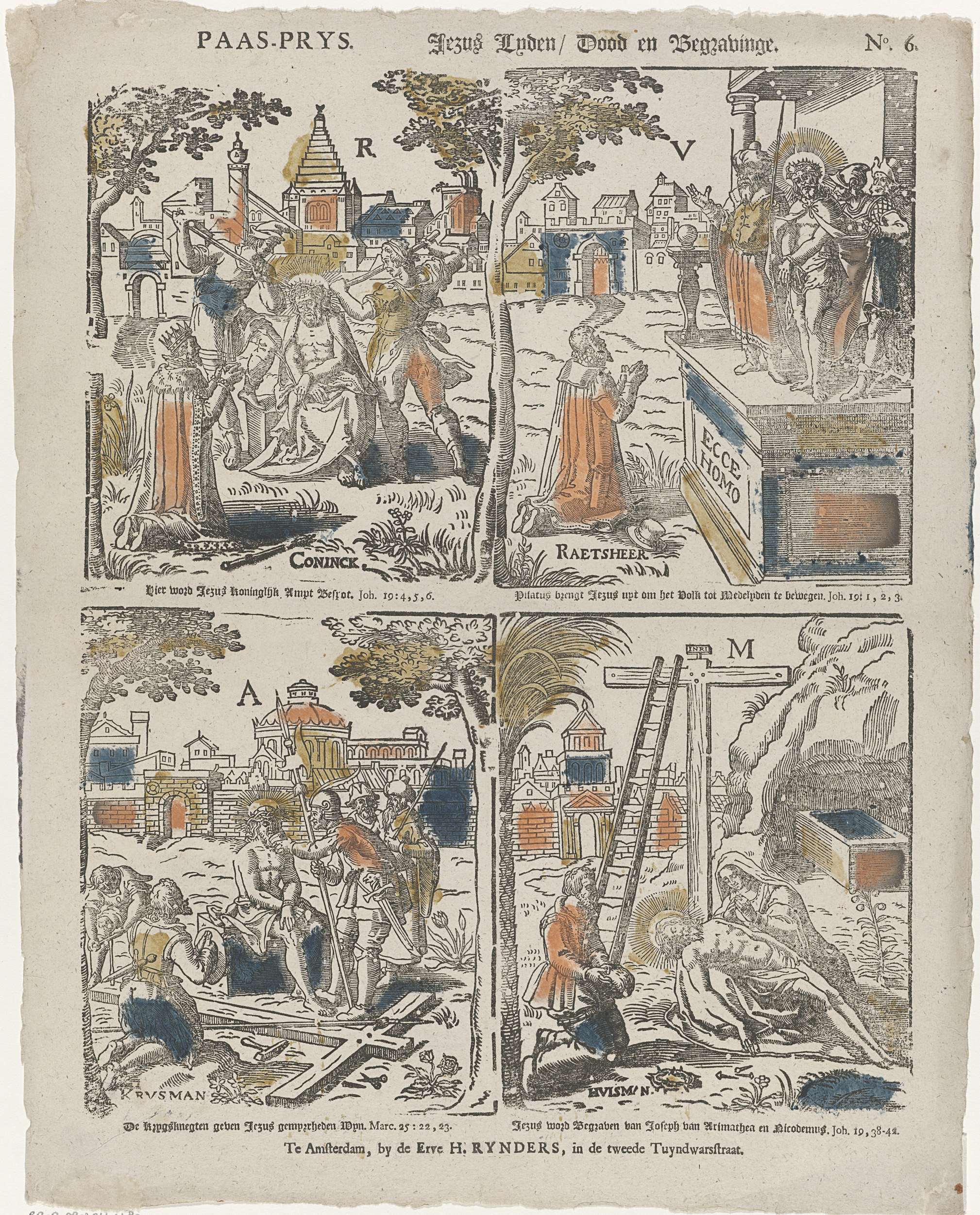 Blad met 4 voorstellingen uit het leven van Christus: de doornenkroning, Christus aan het volk getoond (Ecce Homo), Christus op de koude steen terwijl soldaten hem te drinken geven en de bewening van Christus met Maria en Nicodemus onder het kruis. Linksonder in elke afbeelding een knielende persoon met in boekdruk de tekst: Coninck / ...