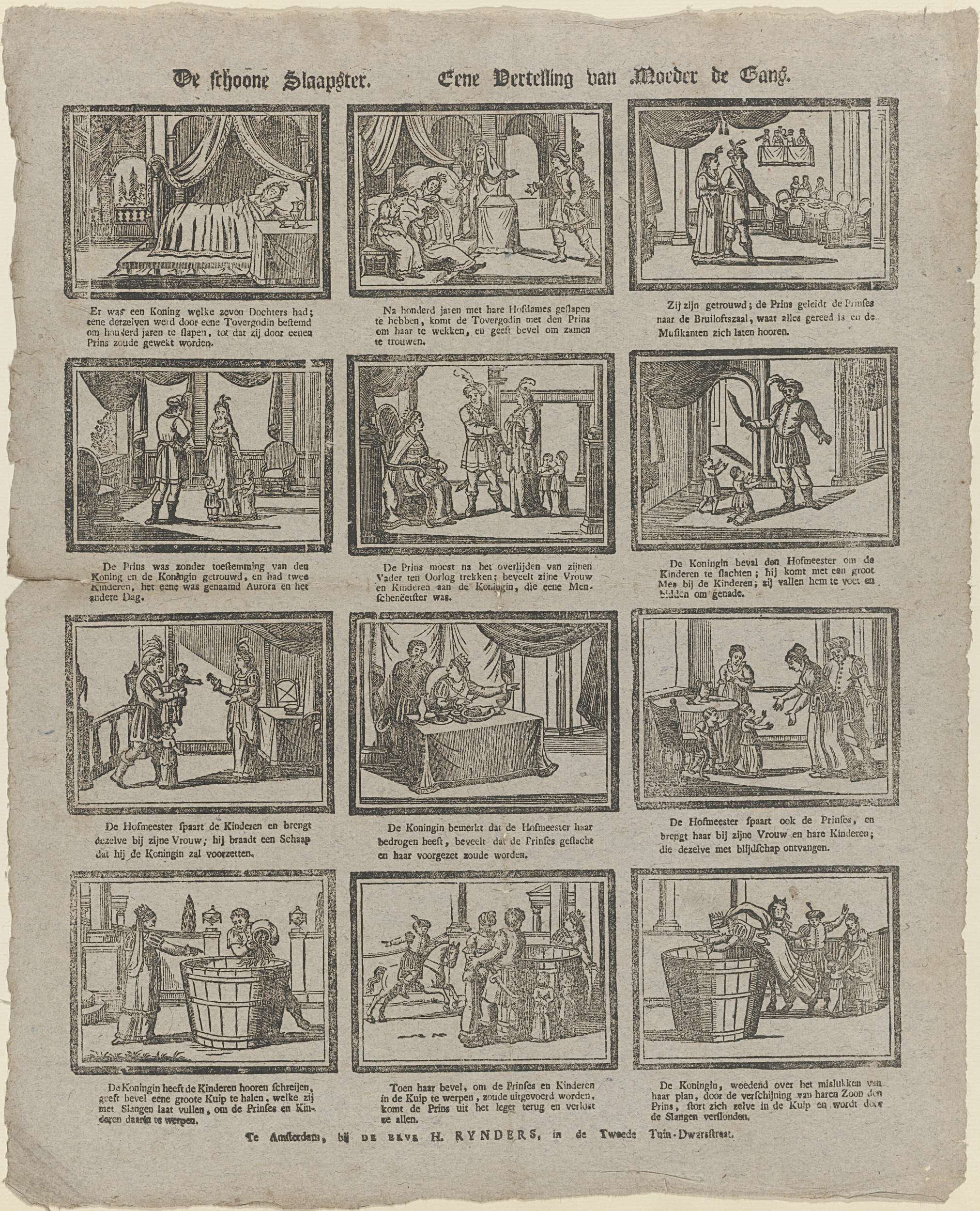 Blad met 12 voorstellingen uit het sprookje van de Schone Slaapster en haar gemene schoonmoeder de koningin. De koningin probeert de prinses en haar kinderen te vermoorden. Onder elke voorstelling een onderschrift.