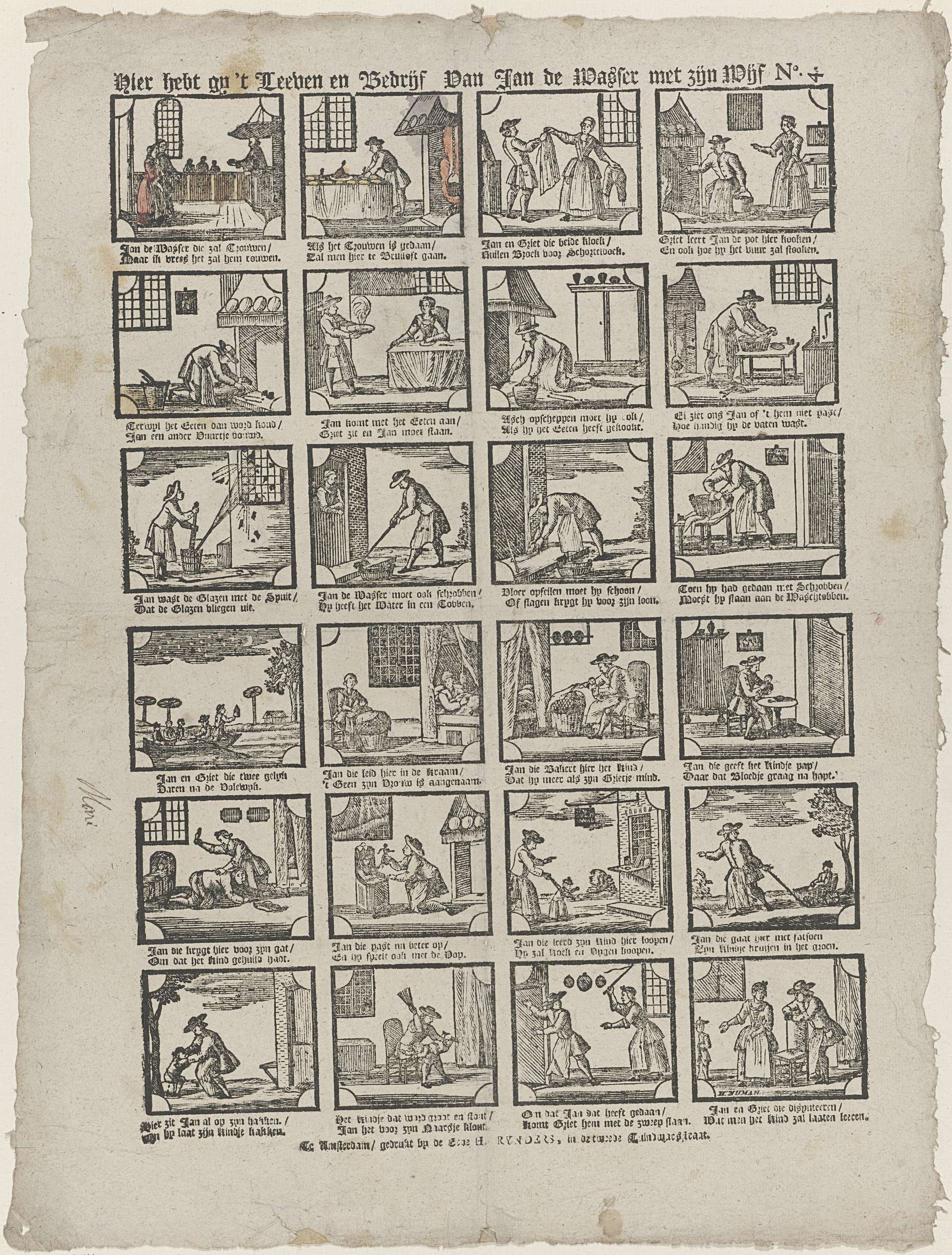 Blad met 24 voorstellingen over het leven van Jan de Wasser, een man die van zijn vrouw Griet, die de broek aan heeft, al het huishoudelijk werk moet doen. Onder elke afbeelding een tweeregelig vers. Genummerd rechtsboven: No. 4.