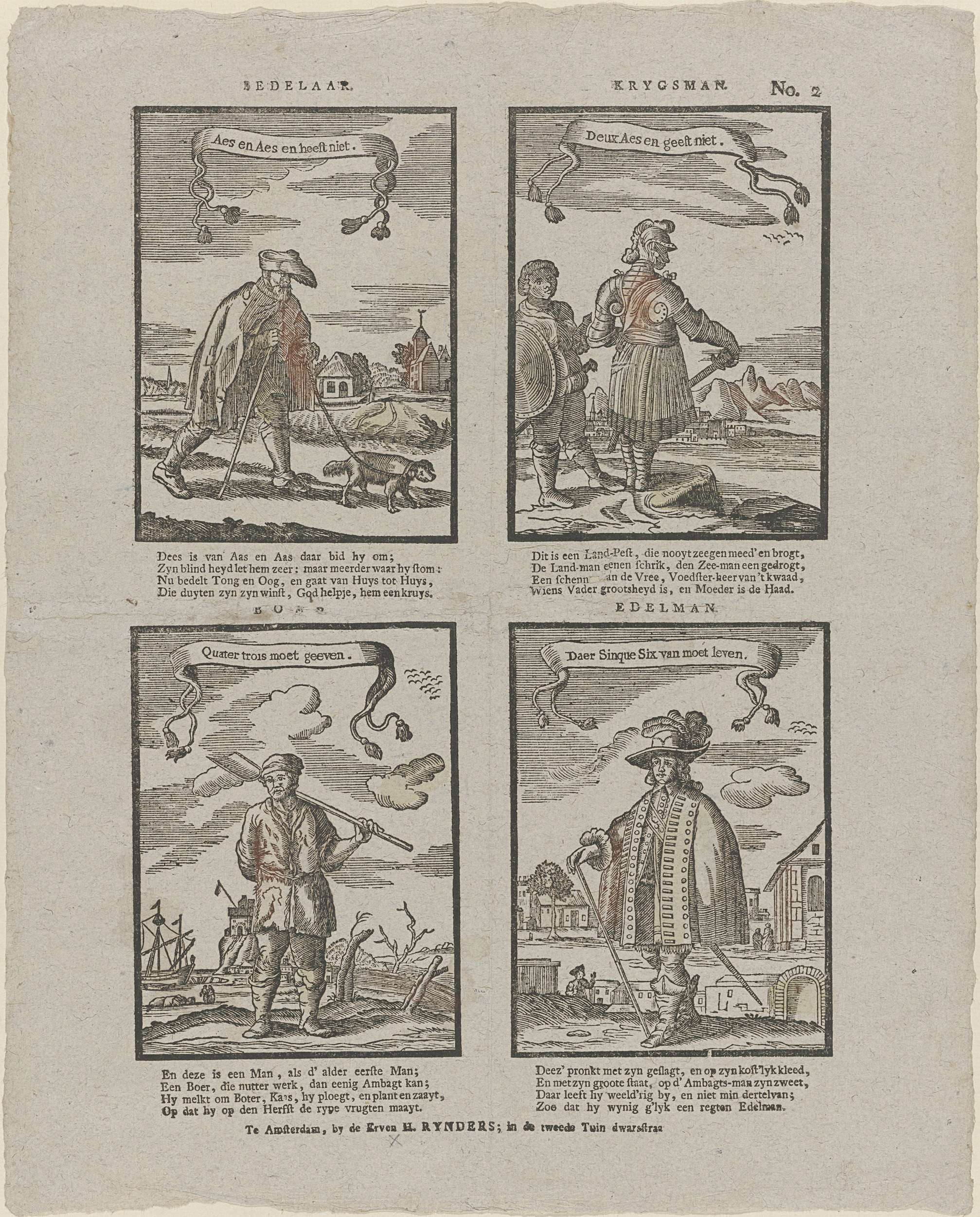 Blad met 4 voorstellingen van een bedelaar, een soldaat, een boer en een edelman (de vier standen). Boven elk figuur een banderol met tekst. Onder elke afbeelding een vierregelig vers. Genummerd rechtsboven: No. 2.