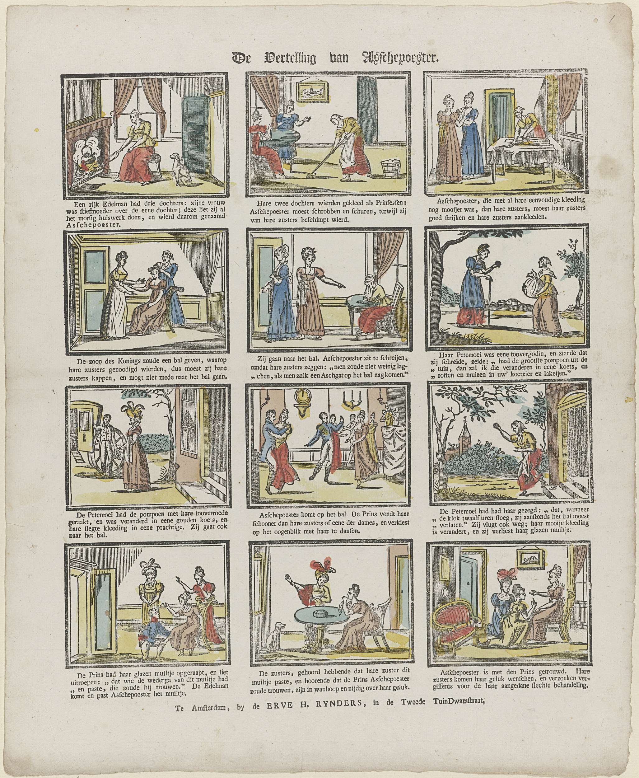 Blad met 12 voorstellingen uit het sprookje van Assepoester. Onder elke afbeelding een onderschrift.