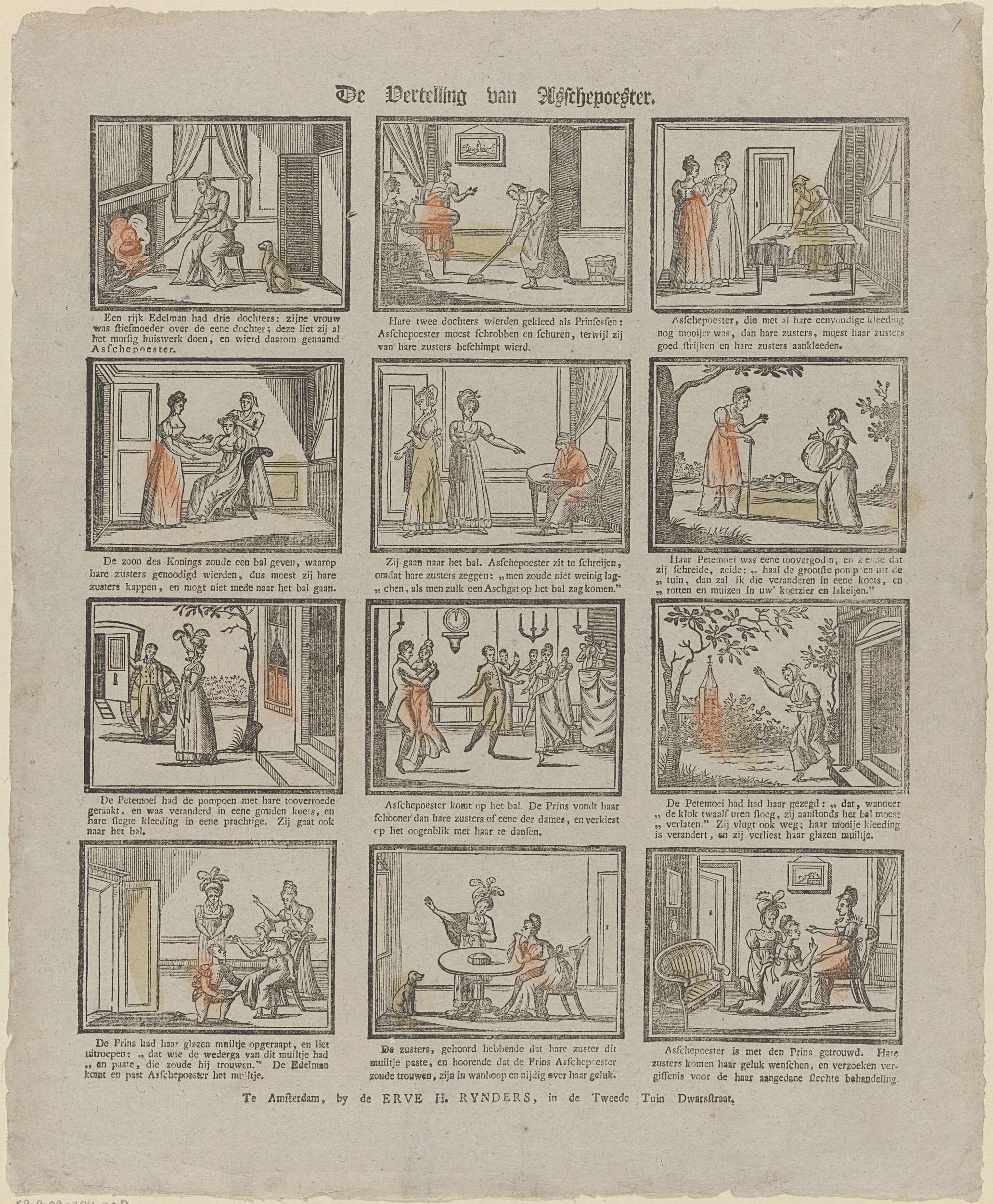 Blad met 12 voorstellingen uit het sprookje van Assepoester. Onder elke afbeelding een onderschrift.