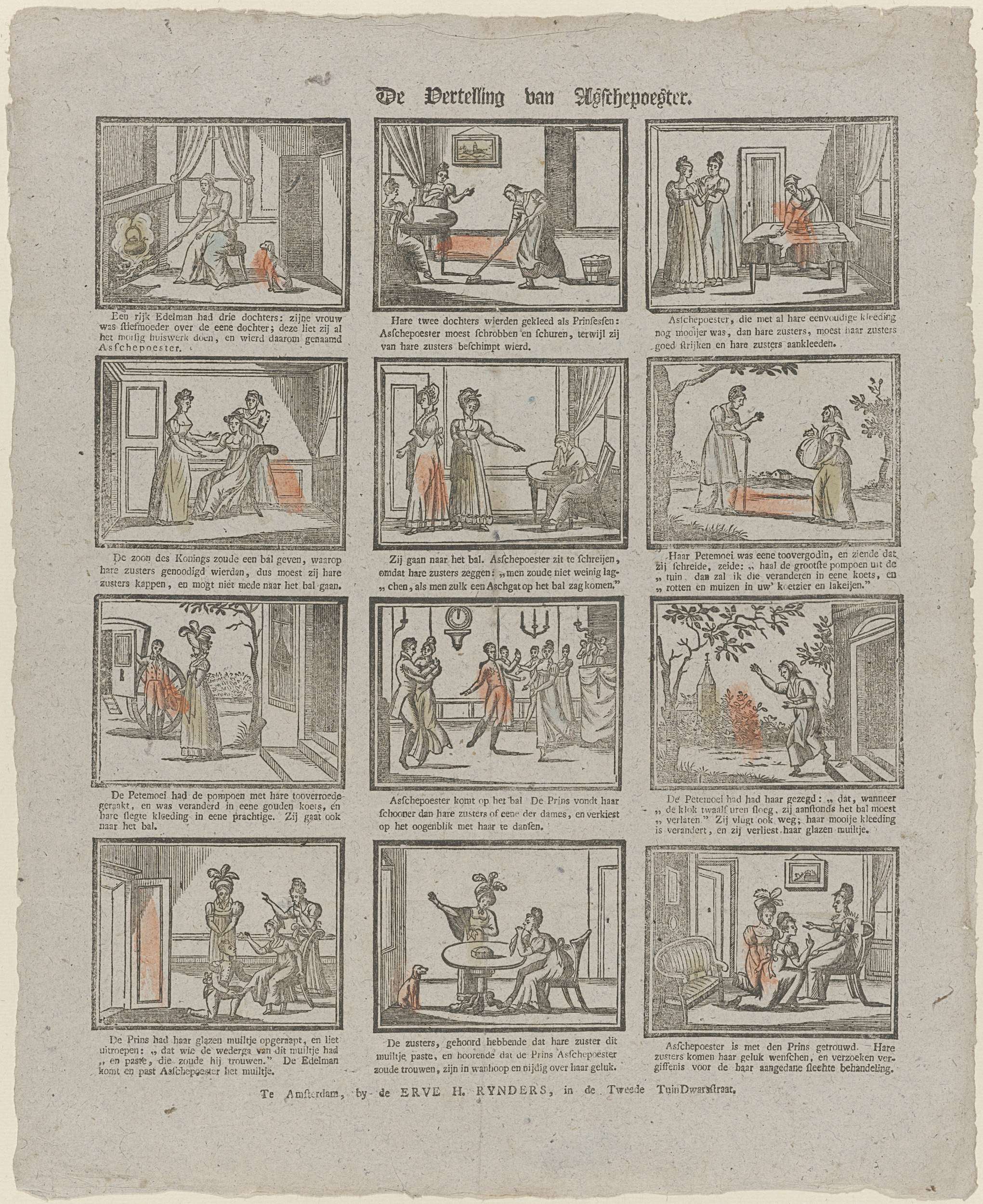 Blad met 12 voorstellingen uit het sprookje van Assepoester. Onder elke afbeelding een onderschrift.