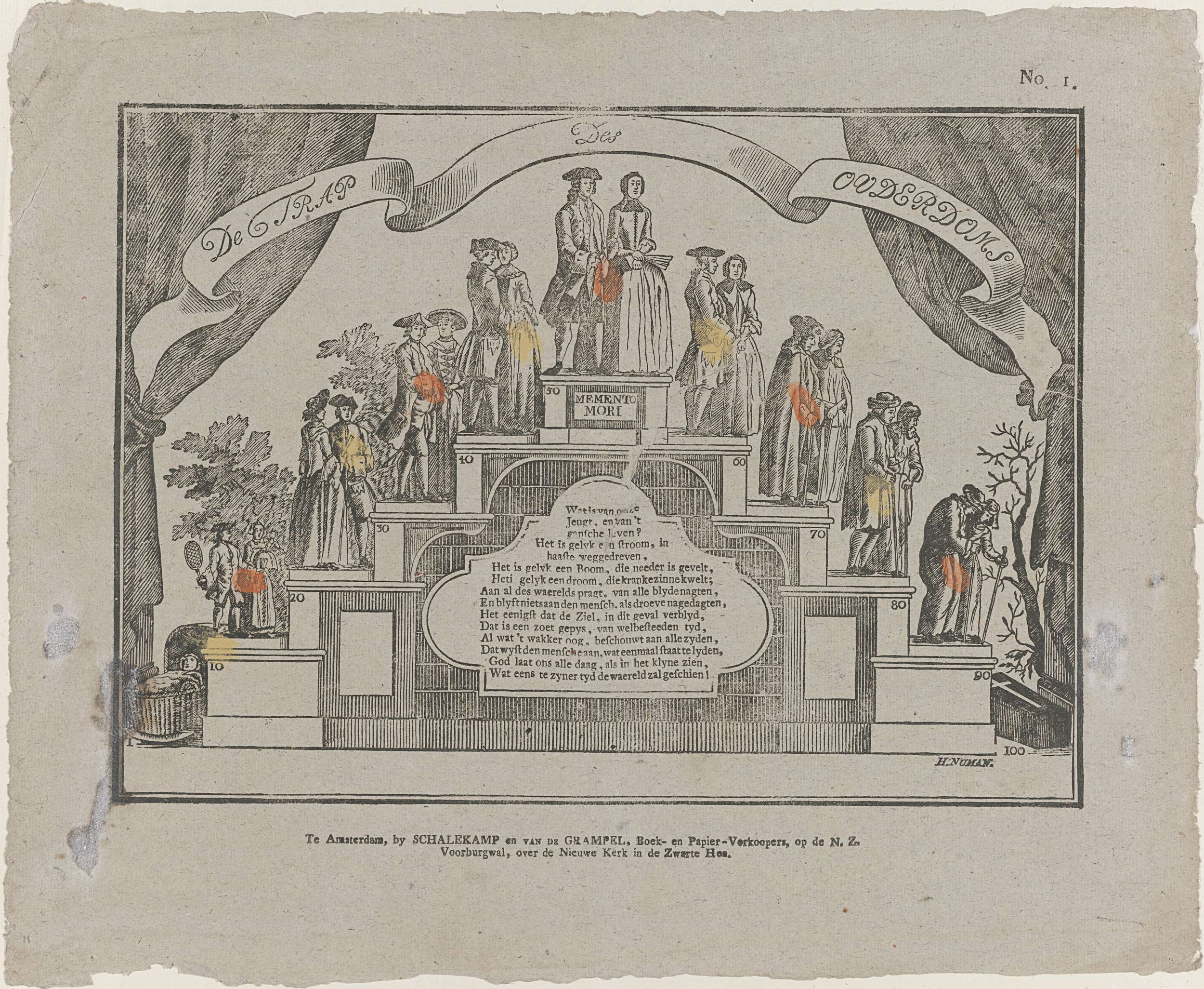 Een trap des ouderdoms: een parentrap. Op de treden van de trap, in de vorm van een brug, staan mannen en vrouwen in de leeftijd van 0 tot 100 jaar. Onder de brug een cartouche met vers. Aan weerszijden van de voorstelling een gordijn. Genummerd rechtsboven: No. 1.