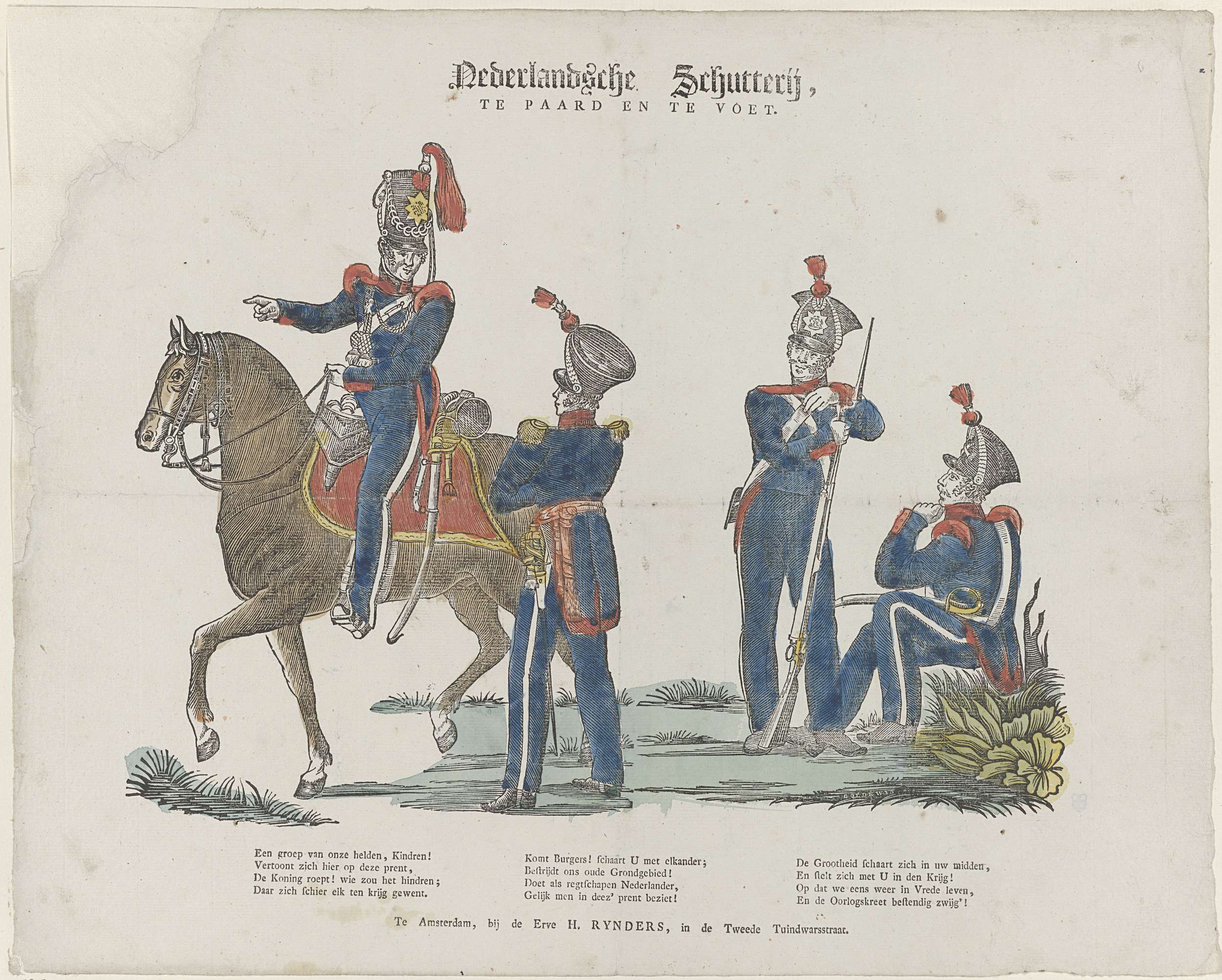Blad met een grote voorstelling van vier militairen, waarvan één te paard. Onder de afbeelding een twaalfregelig vers in drie kolommen.