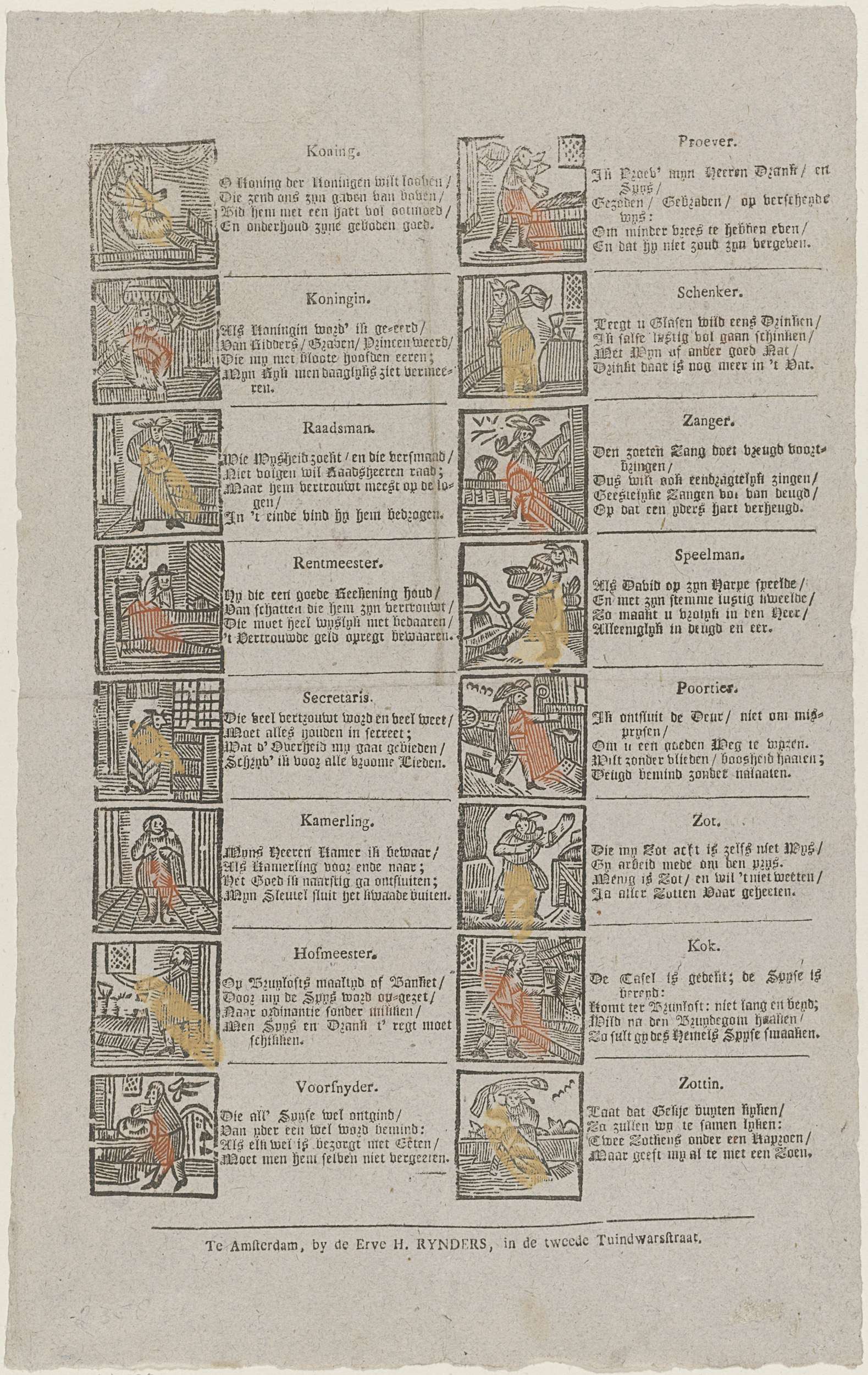 Blad met 16 voorstellingen (driekoningenbriefjes) van verschillende functies binnen het hof, waaronder een raadsman, een proever en een portier. Rechts naast elke afbeelding een vierregelig vers.