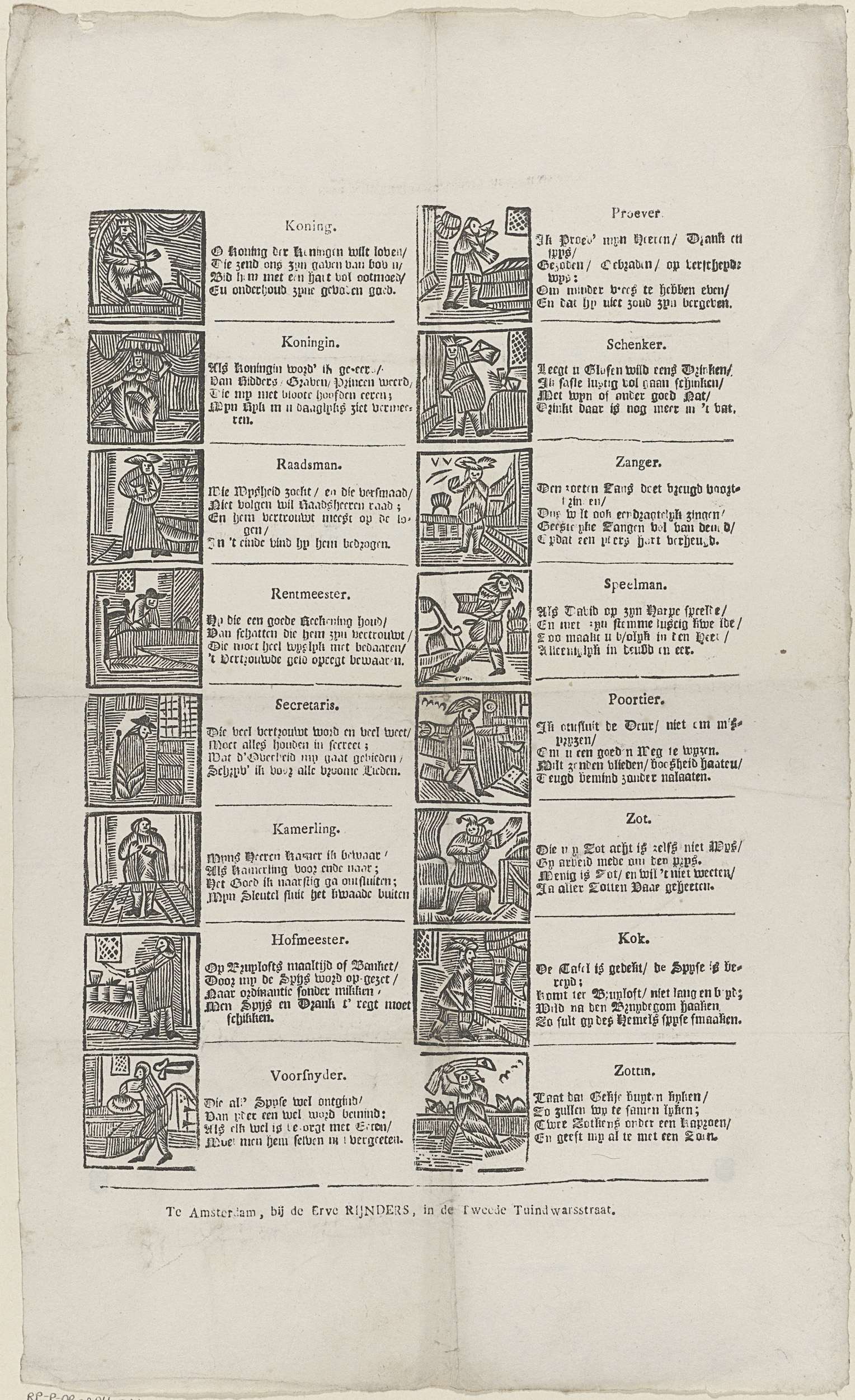 Blad met 16 voorstellingen (driekoningenbriefjes) van verschillende functies binnen het hof, waaronder een raadsman, een proever en een portier. Rechts naast elke afbeelding een vierregelig vers.