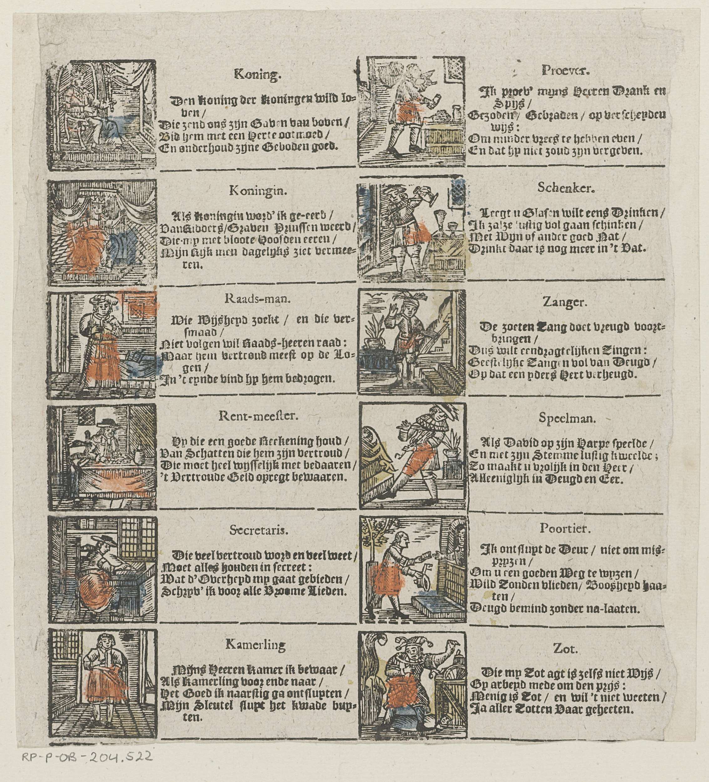 Blad met 12 voorstellingen (bodem afgescheurd, oorspronkelijk 16 voorstellingen) (driekoningenbriefjes) van verschillende functies binnen het hof, waaronder een raadsman, een proever en een portier. Rechts naast elke afbeelding een vierregelig vers.