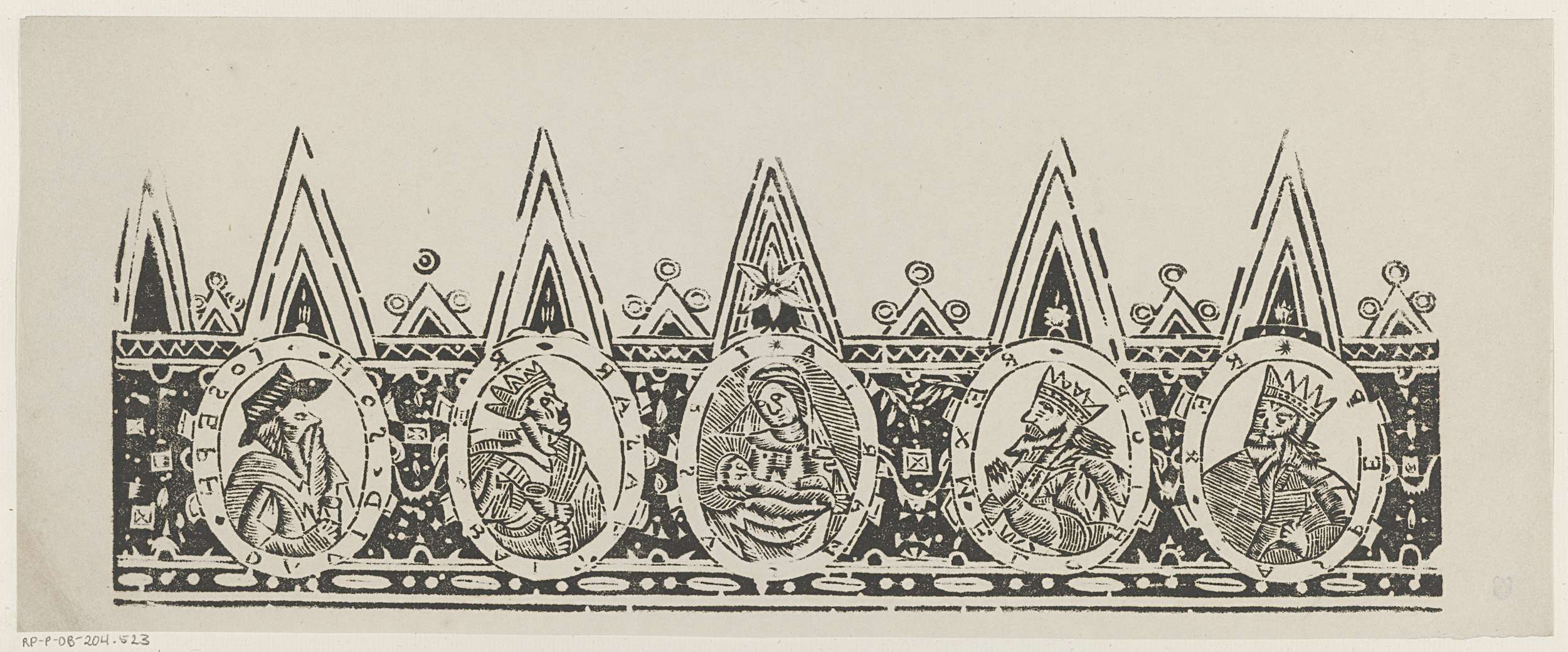 Kroon om uit te knippen. Deze kronen werden tijdens het driekoningenfeest gedragen nadat de briefjes waren getrokken. Op de kroon staan afgebeeld Maria, Jozef en de drie koningen.