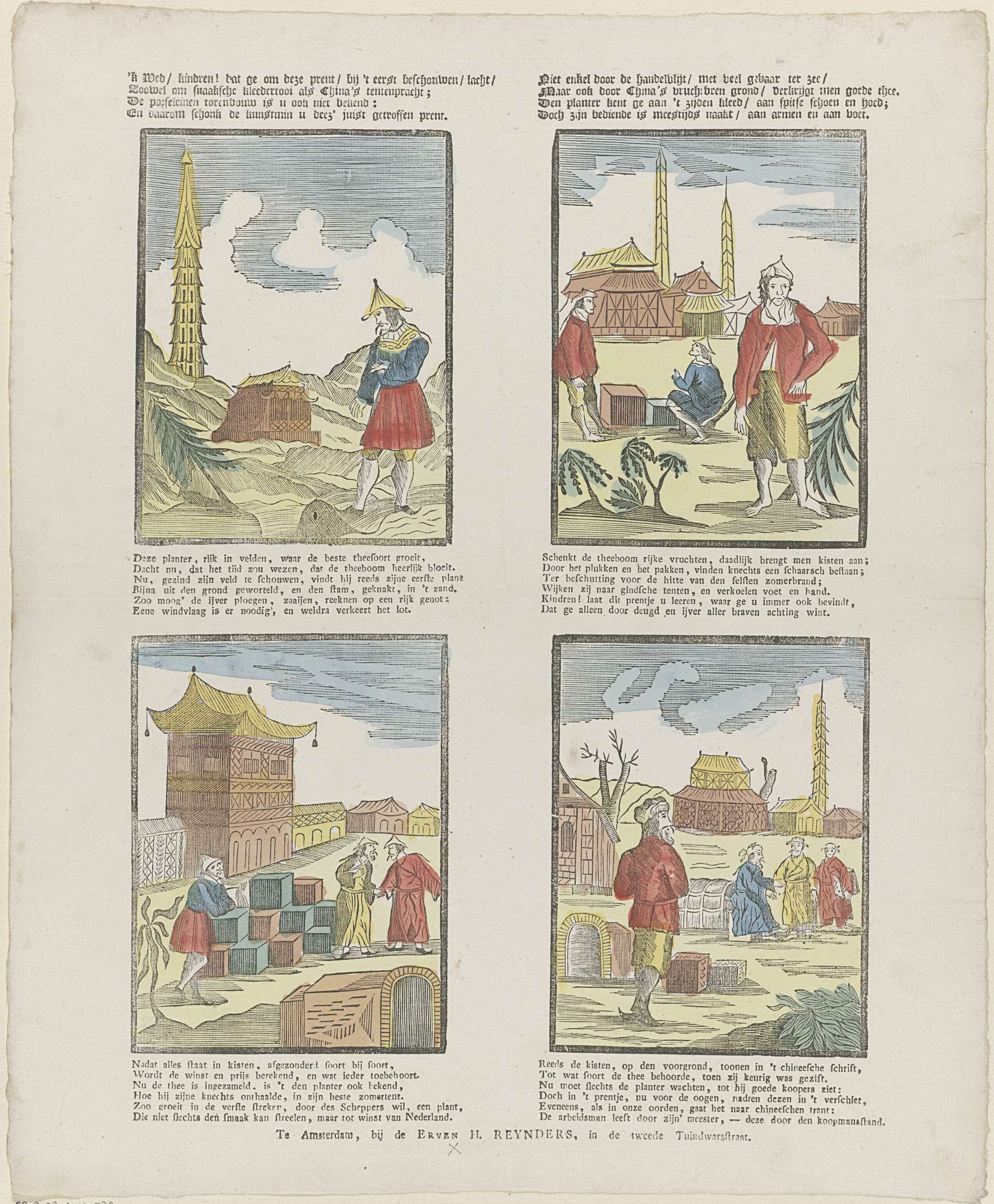 Blad met 4 voorstellingen van Chinezen en Chinese gebouwen. Onder elke afbeelding een zesregelig vers.