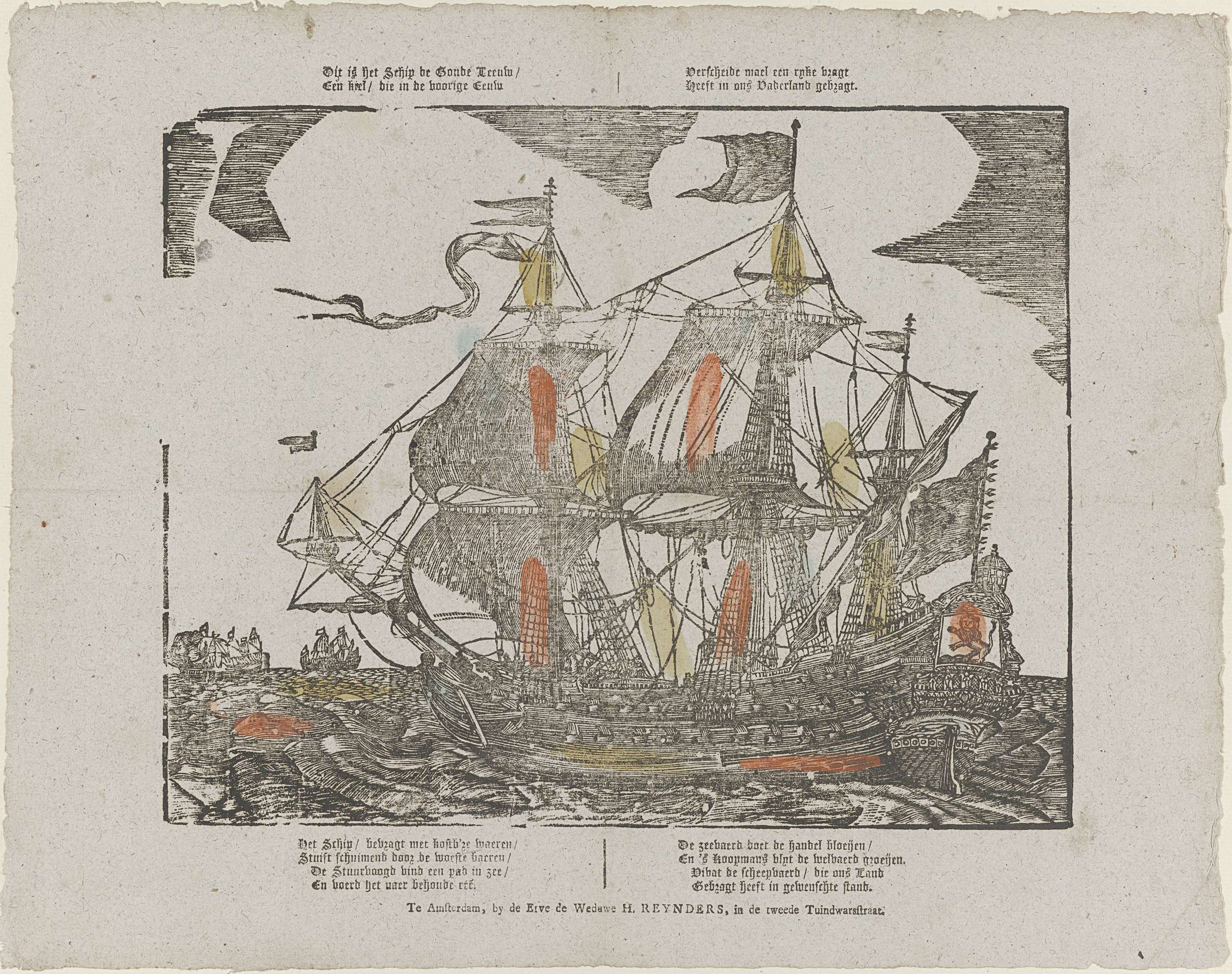 Dit is het schip de Goude Leeuw / Een kiel / die in de voorige eeuw / Verscheide mael een ryke vragt / Heeft in ons vaderland gebragt