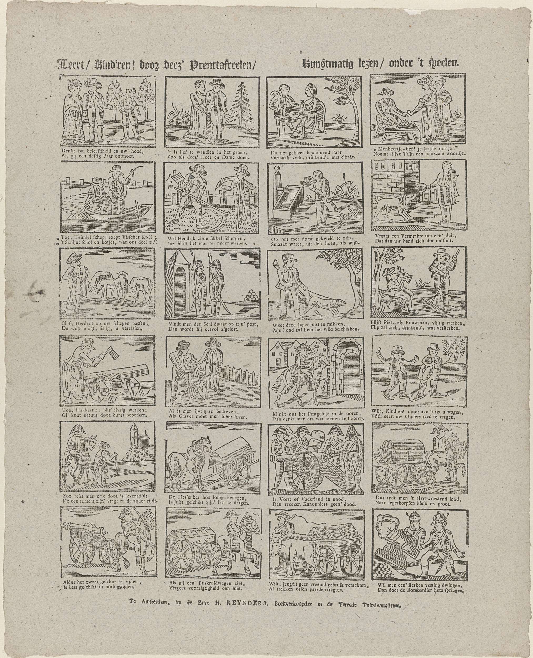Blad met 24 voorstellingen van figuren, bezigheden, beroepen en soldaten. Onder elke voorstelling een tweeregelig vers.