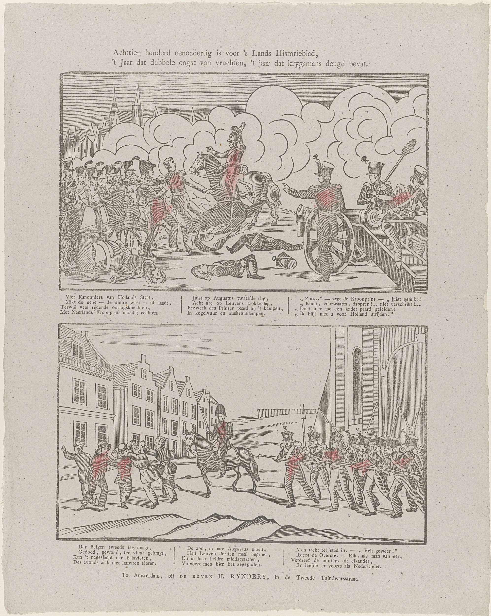 Blad met 2 voorstellingen van de Slag bij Leuven in 1831. Onder elke voorstelling een vers in drie kolommen.