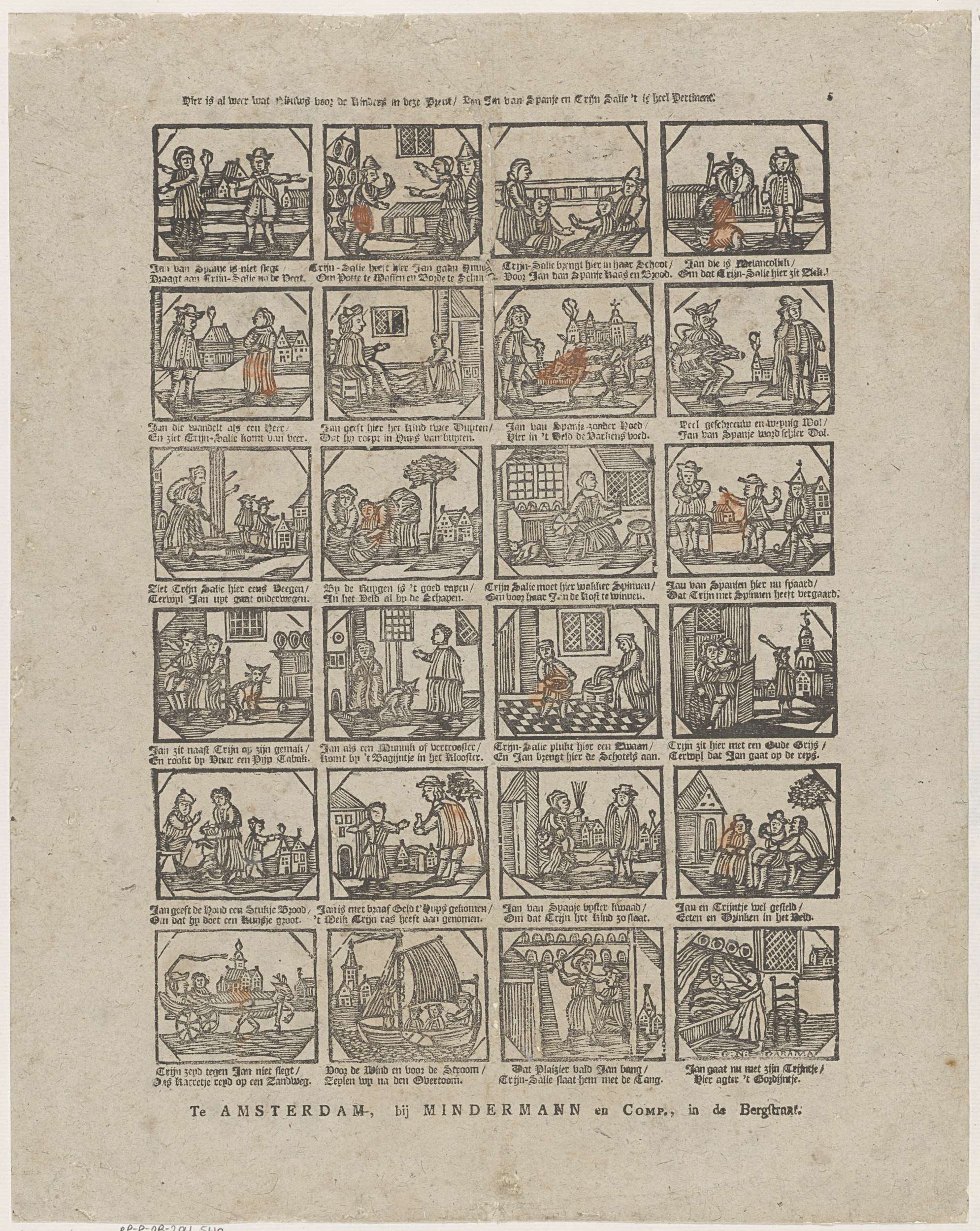 Blad met 24 voorstellingen over het leven van Jan van Spanje en zijn vrouw Trijn Salie. Onder elke afbeelding een tweeregelig vers. Genummerd rechtsboven: 5.