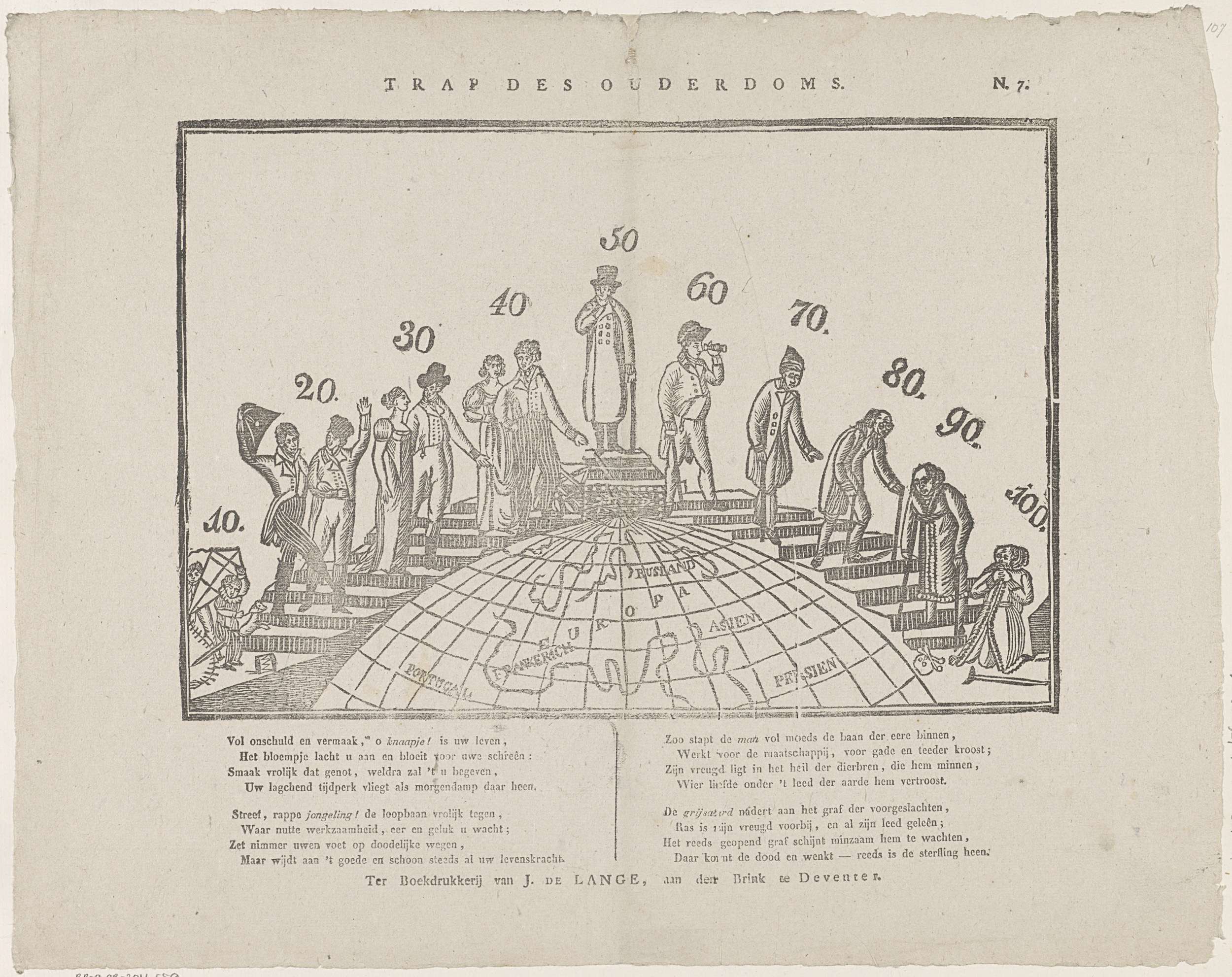 Een trap des ouderdoms: een mannentrap. Op de treden van de trap, lopend over de aardbol (het noordelijk halfrond), staan mannen in de leeftijd van 10 tot 100 jaar. Onder de afbeelding een vers in twee kolommen. Genummerd rechtsboven: N. 7.
