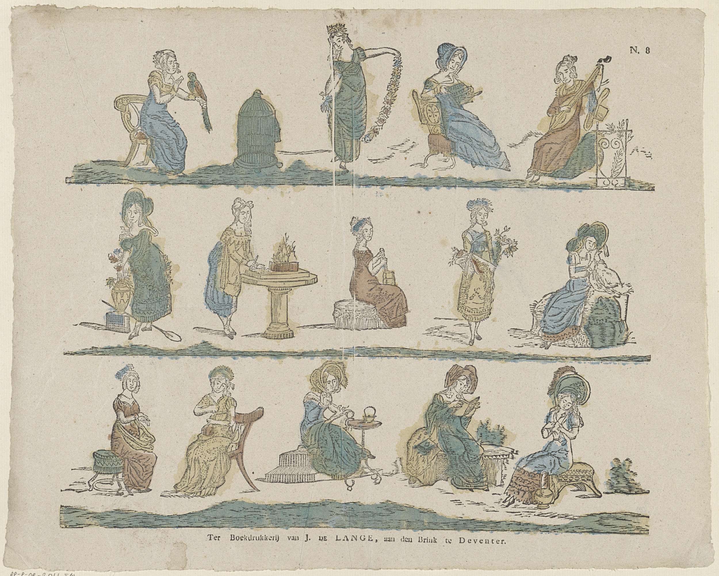 Blad met 3 rijen met voorstellingen van bezigheden voor vrouwen, zoals dansen, lezen en muziek maken. Genummerd rechtsboven: N. 8.