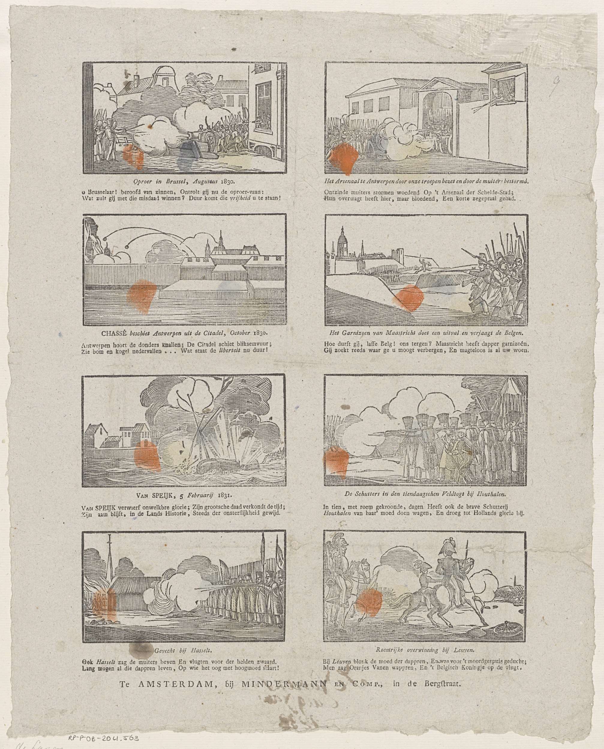 Blad met 8 voorstellingen over de strijd tegen de Belgen en de zelfopoffering van J.C.J. van Speyk. Onder elke afbeelding een onderschrift.