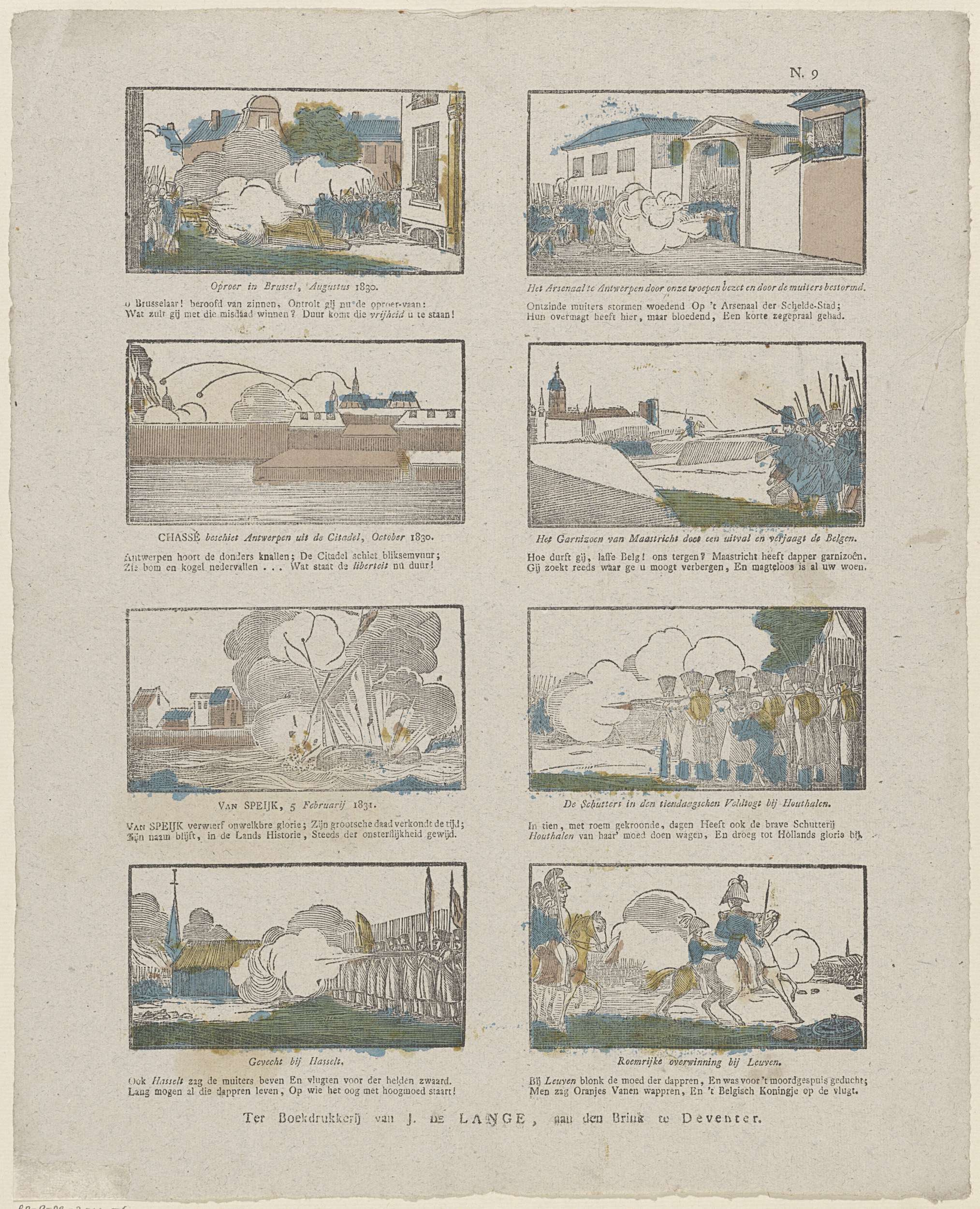 Blad met 8 voorstellingen over de strijd tegen de Belgen en de zelfopoffering van J.C.J. van Speyk. Onder elke afbeelding een onderschrift.