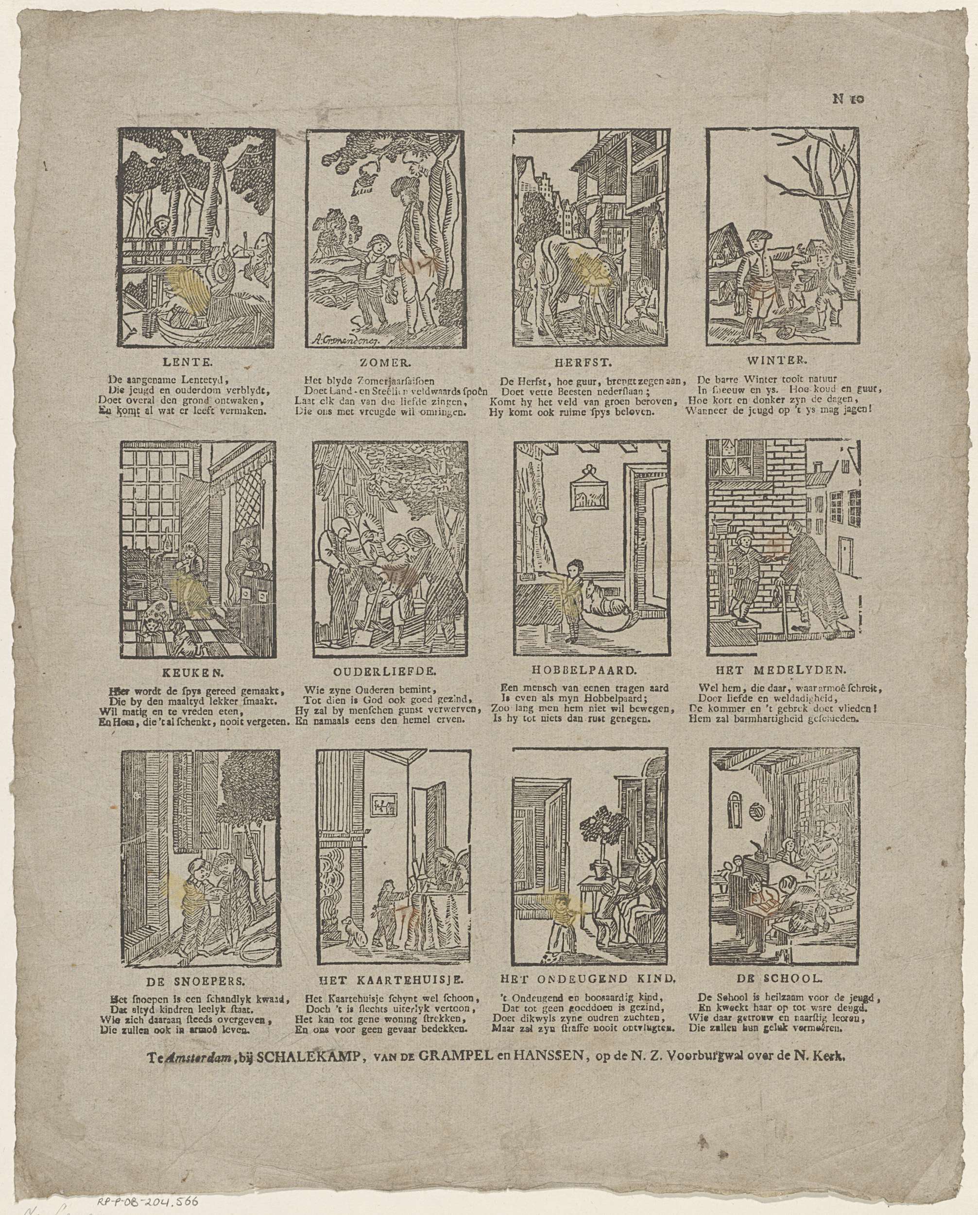 Blad met 12 voorstellingen van verschillende aard, waaronder verbeeldingen van de vier seizoenen en voorstellingen van een hobbelpaard en twee snoepende kinderen. Onder elke afbeelding een titel en een vierregelig vers. Genummerd rechtsboven: N 10.