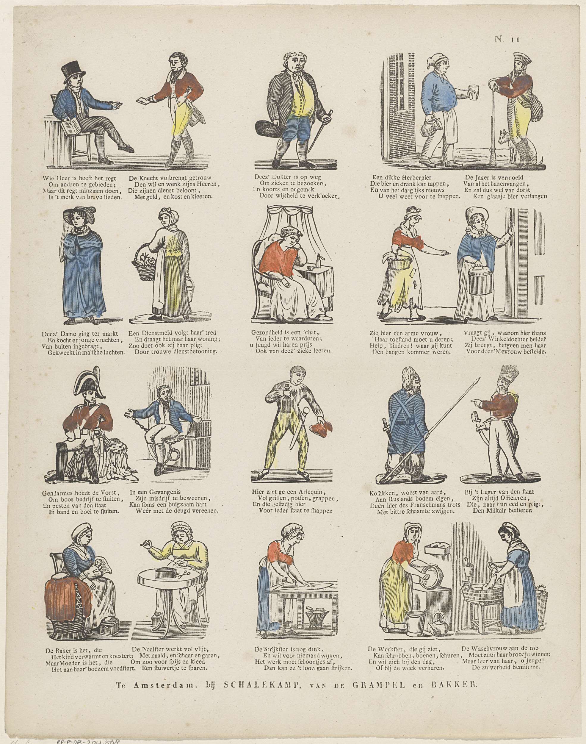 Blad met 15 voorstellingen van verschillende beroepen en bezigheden voor mannen en vrouwen. Onder elke figuur een vierregelig vers. Genummerd rechtsboven: N. 11.
