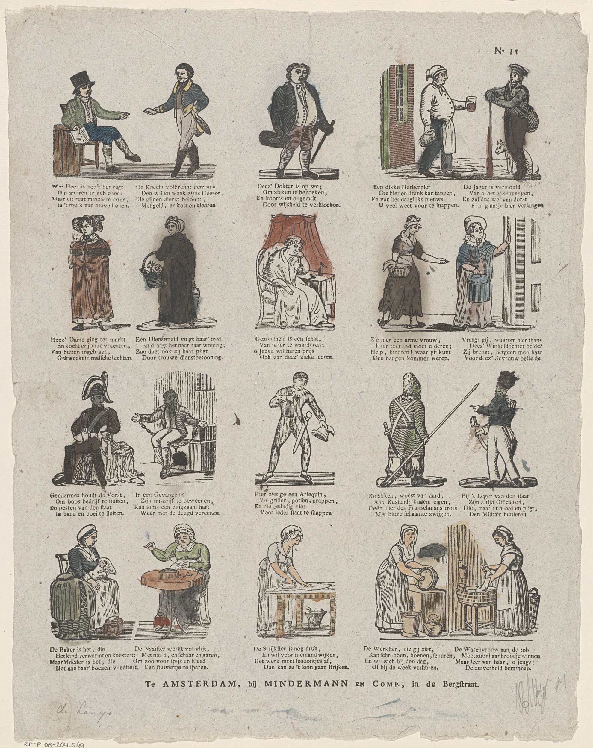 Blad met 15 voorstellingen van verschillende beroepen en bezigheden voor mannen en vrouwen. Onder elke figuur een vierregelig vers. Genummerd rechtsboven: N. 11.