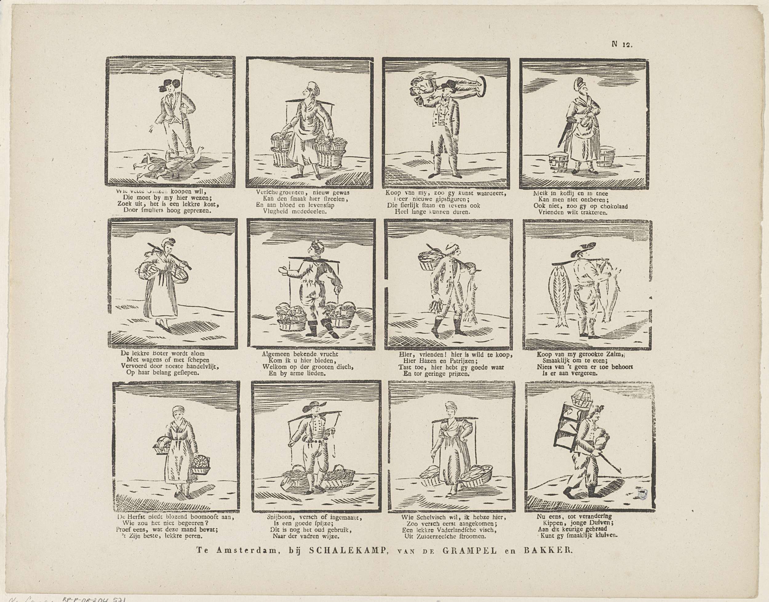 Blad met 12 voorstellingen van straatverkopers, zoals een ganzenverkoper, een boterverkoopster en een zalmverkoper. Onder elke afbeelding een vierregelig vers. Genummerd rechtsboven: N 12.