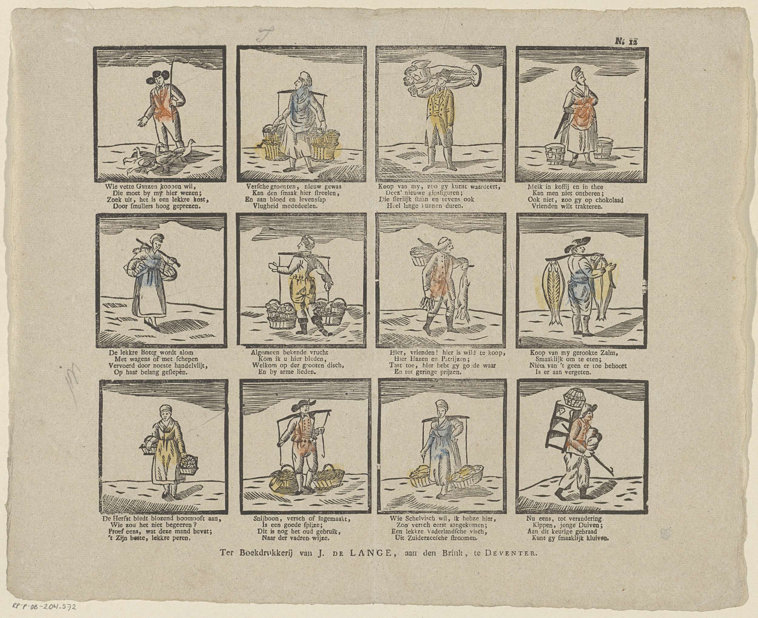 Blad met 12 voorstellingen van straatverkopers, zoals een ganzenverkoper, een boterverkoopster en een zalmverkoper. Onder elke afbeelding een vierregelig vers. Genummerd rechtsboven: N 12.