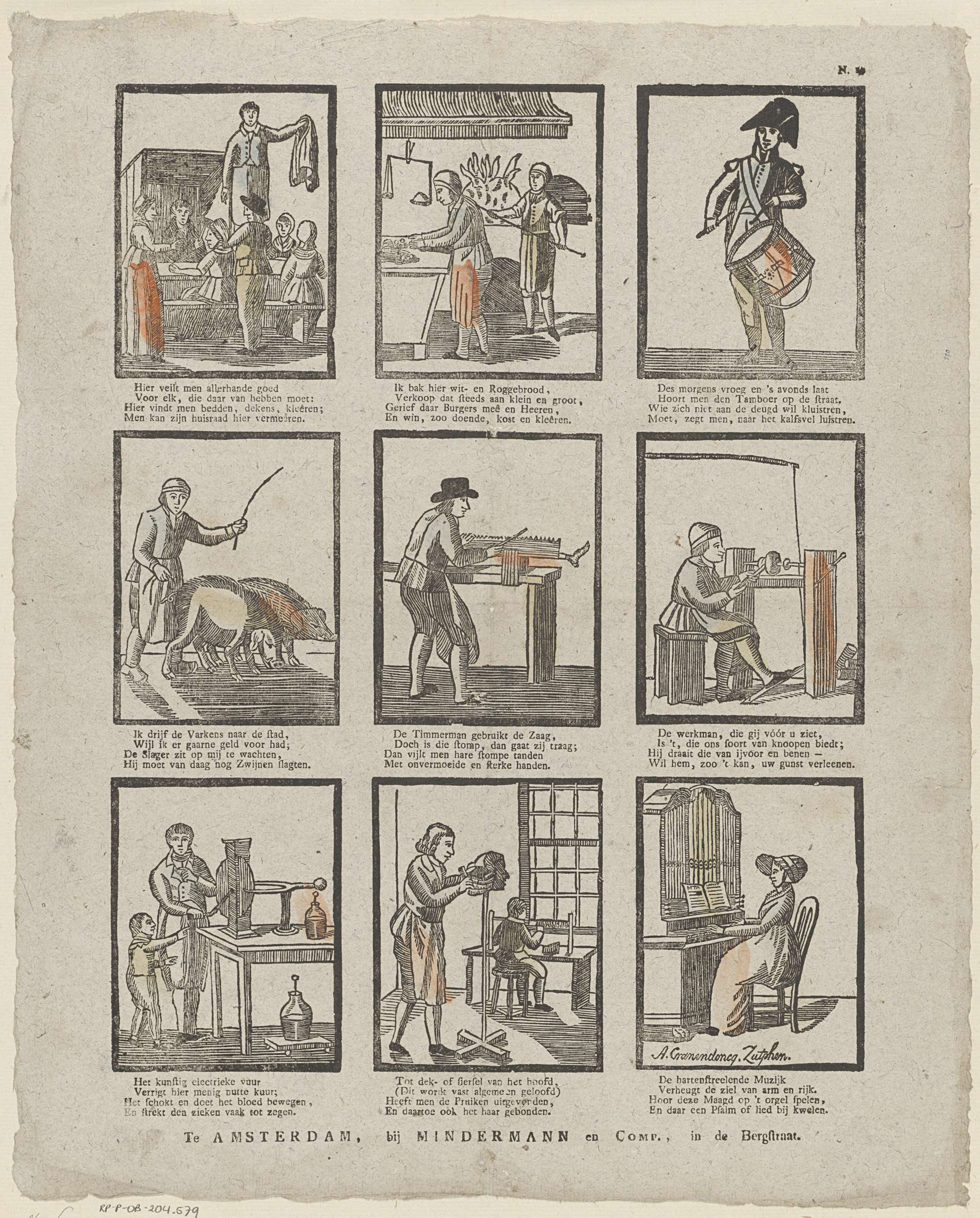 Blad met 9 voorstellingen van ambachtslieden en beroepen, zoals straatverkoper, tamboer, timmerman en pruikenmaker. Onder elke afbeelding een vierregelig vers. Genummerd rechtsboven: N. 17.