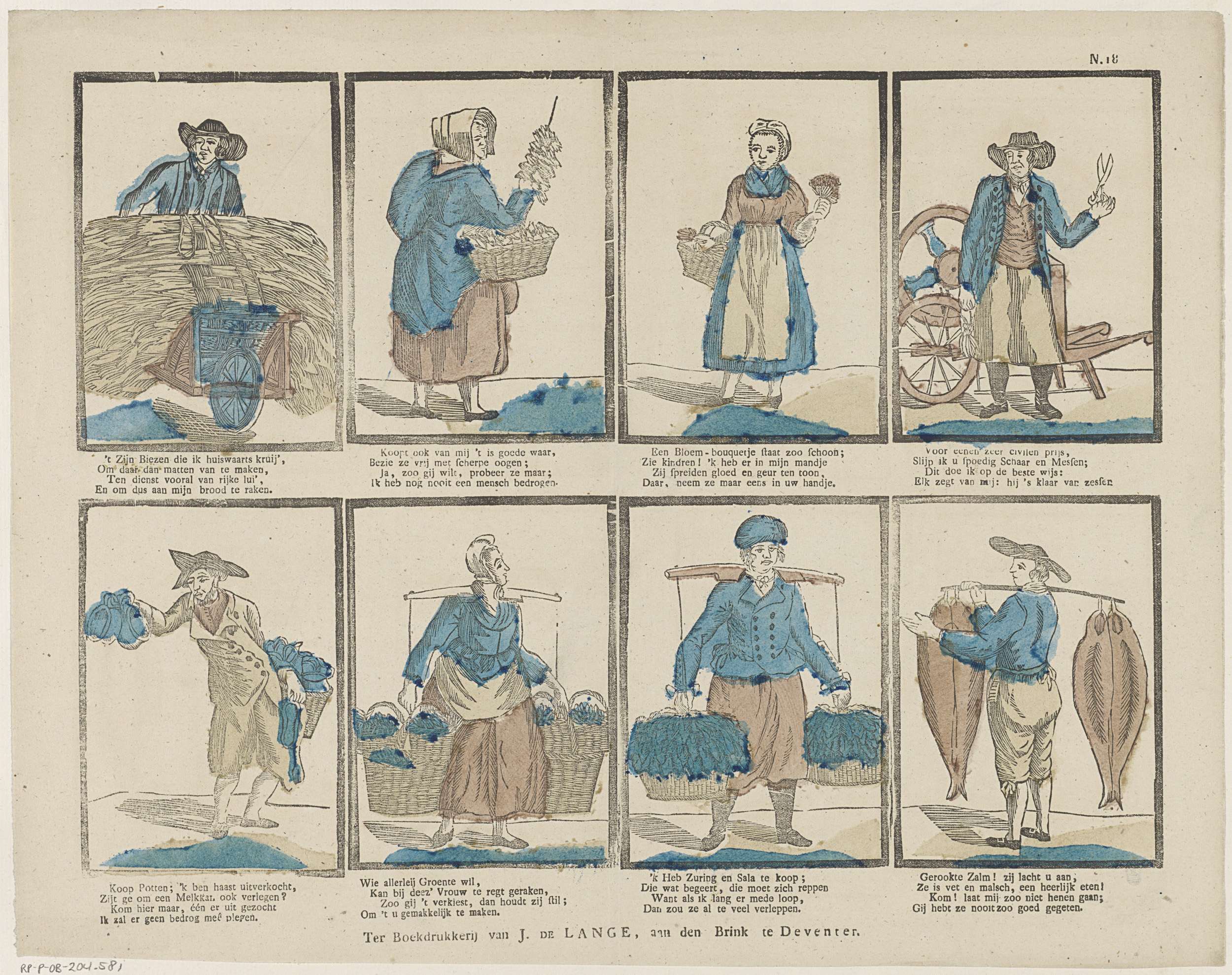 Blad met 8 voorstellingen van straatverkopers, zoals een mattenverkoper, een pottenverkoper en een zalmverkoper. Onder elke afbeelding een vierregelig vers. Genummerd rechtsboven: N. 18.