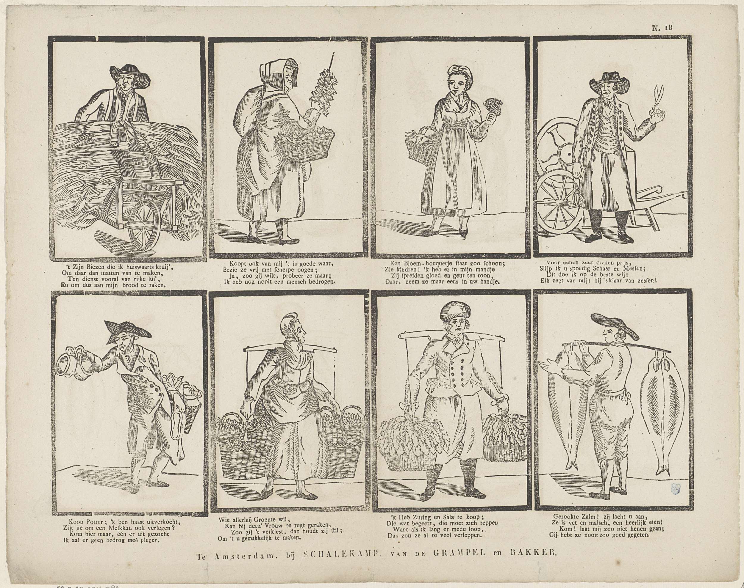 Blad met 8 voorstellingen van straatverkopers, zoals een mattenverkoper, een pottenverkoper en een zalmverkoper. Onder elke afbeelding een vierregelig vers. Genummerd rechtsboven: N. 18.