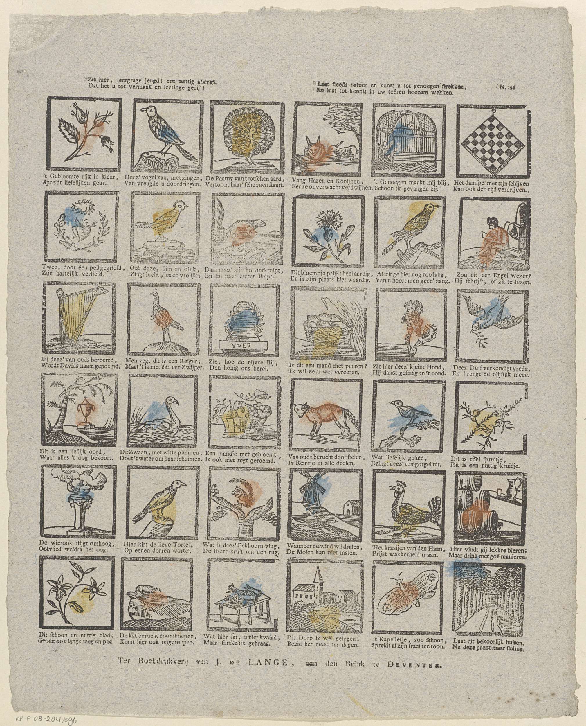 Blad met 36 voorstellingen van dieren, planten, gebouwen en voorwerpen. Onder elke afbeelding een tweeregelig vers. Genummerd rechtsboven: N. 26.