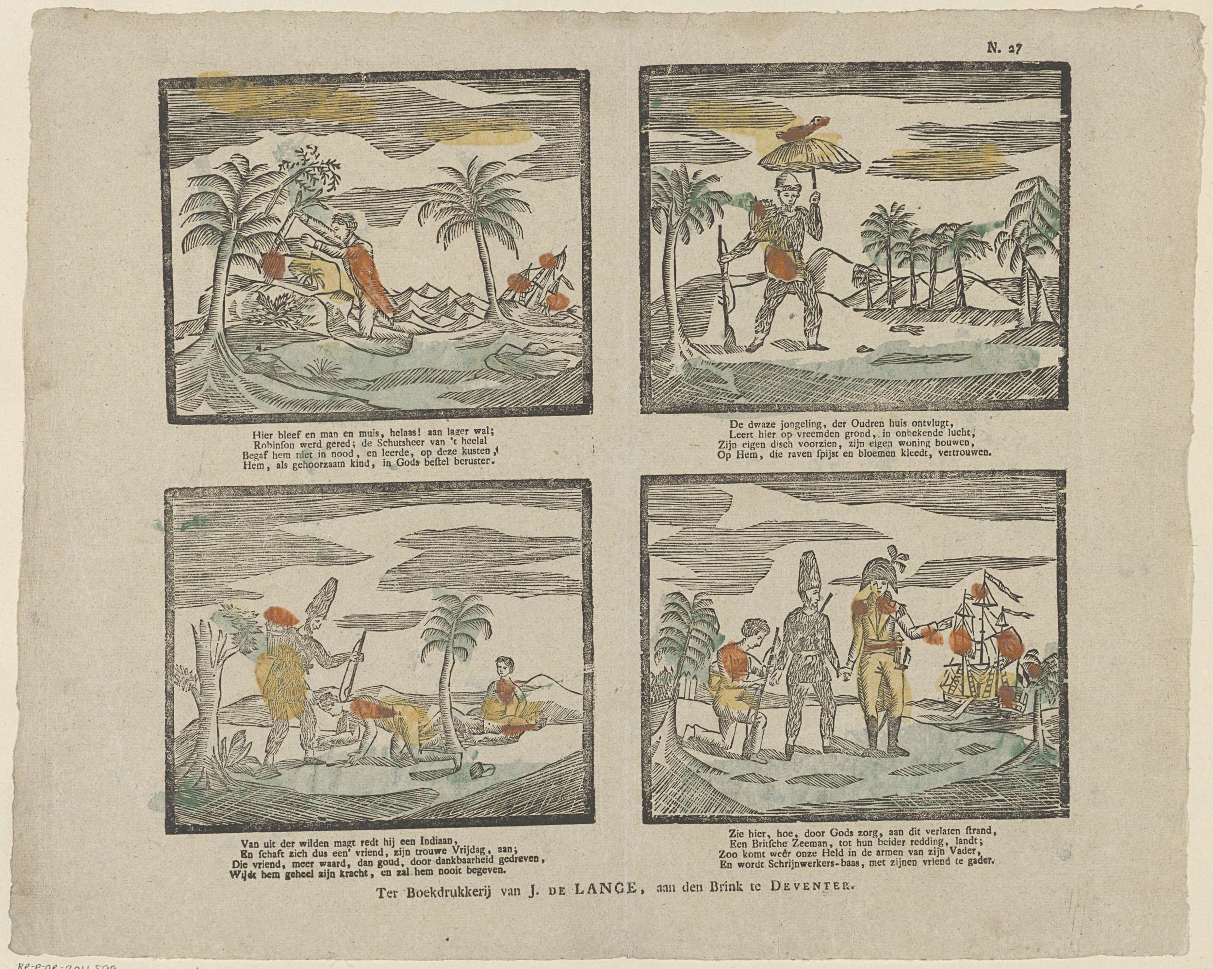 Blad met 4 voorstellingen uit het verhaal van Robinson Crusoe die strandt op een eiland. Onder elke afbeelding een vierregelig vers. Genummerd rechtsboven: N. 27.