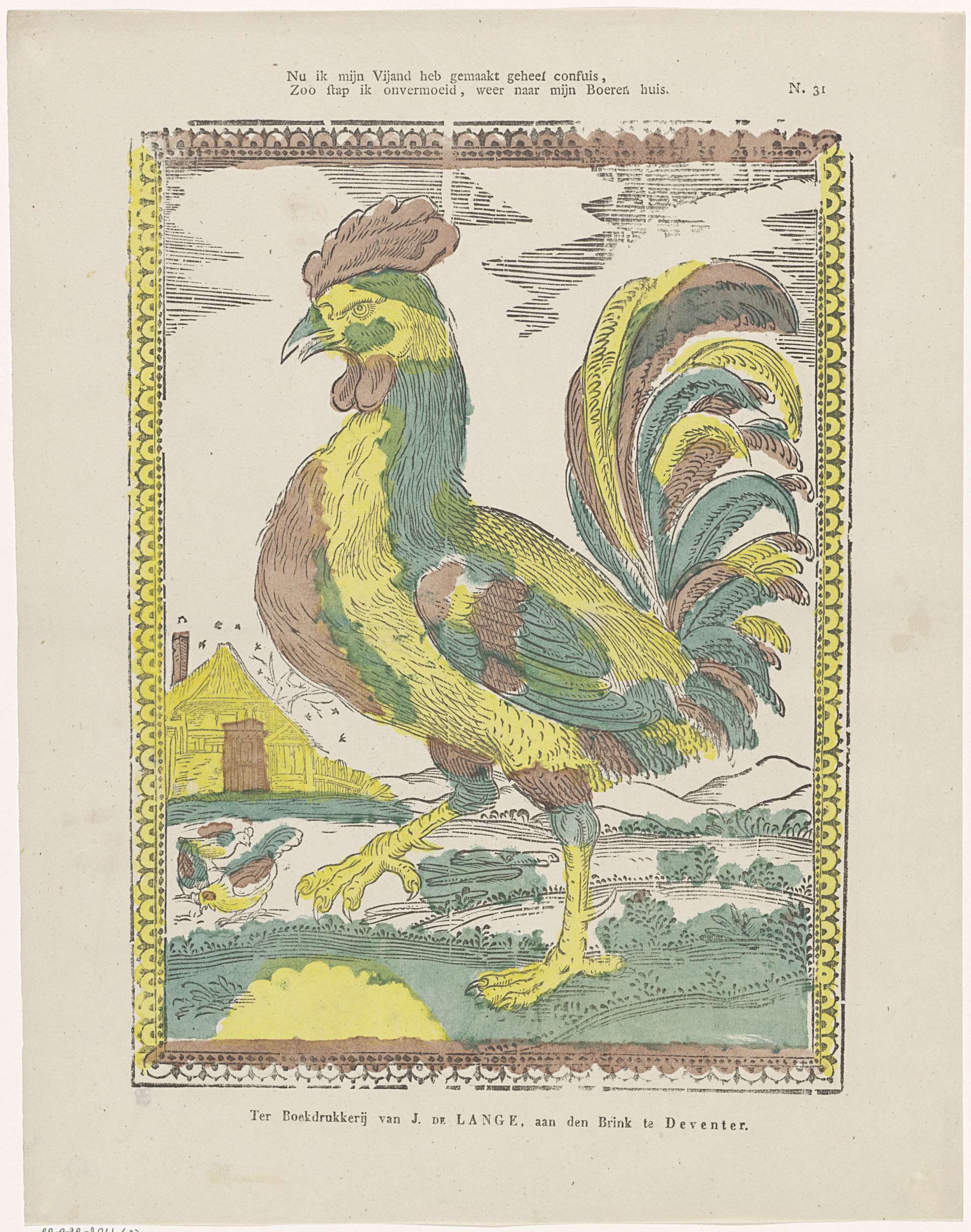 Blad met een grote voorstelling van een haan. Op de achtergrond twee kippen en een boerderij. De voorstelling is gevat in een sierlijst. Genummerd rechtsboven: N. 31.