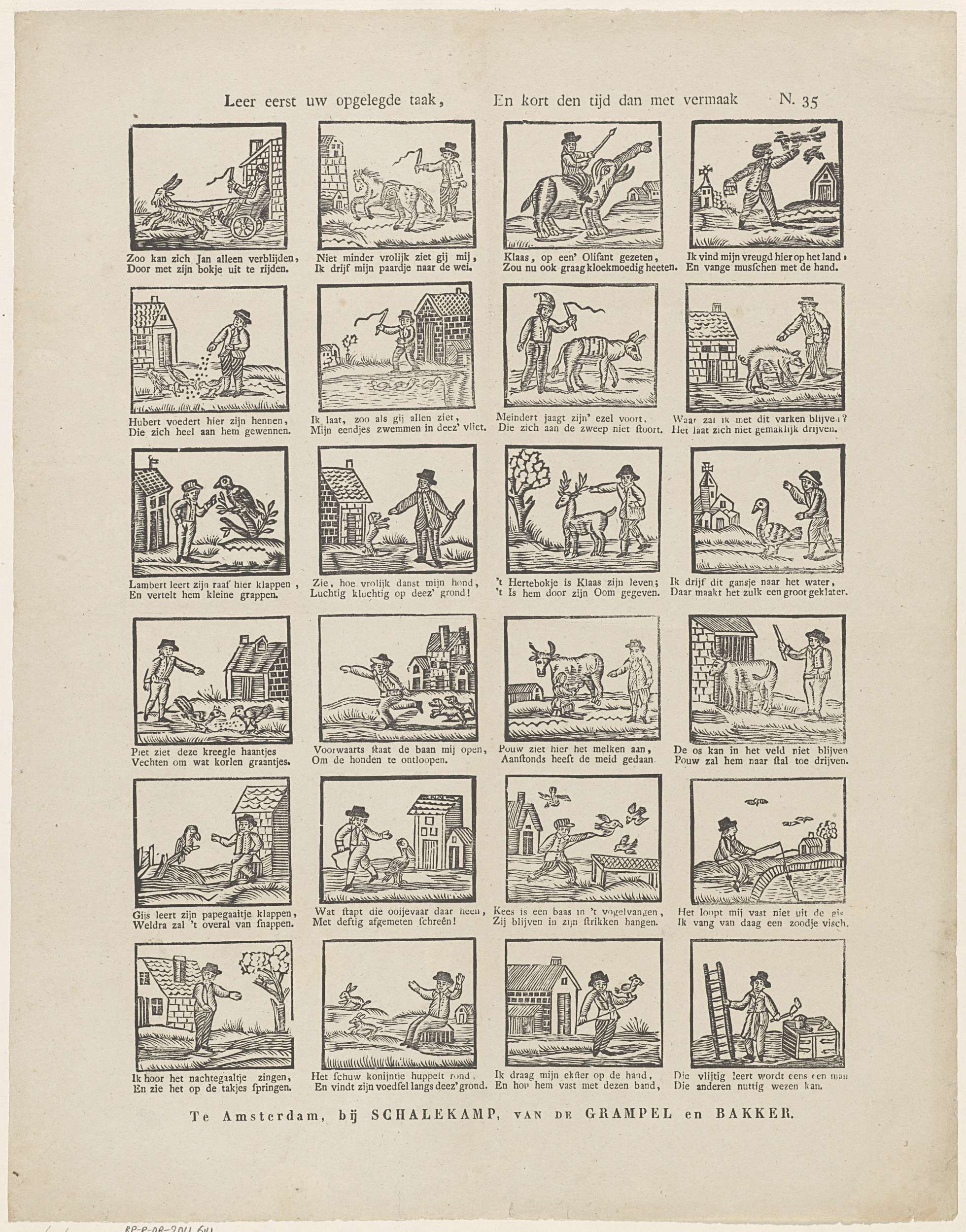 Blad met 24 voorstellingen van kinderen die spelen met dieren. Onder elke afbeelding een tweeregelig vers. Genummerd rechtsboven: N. 35.