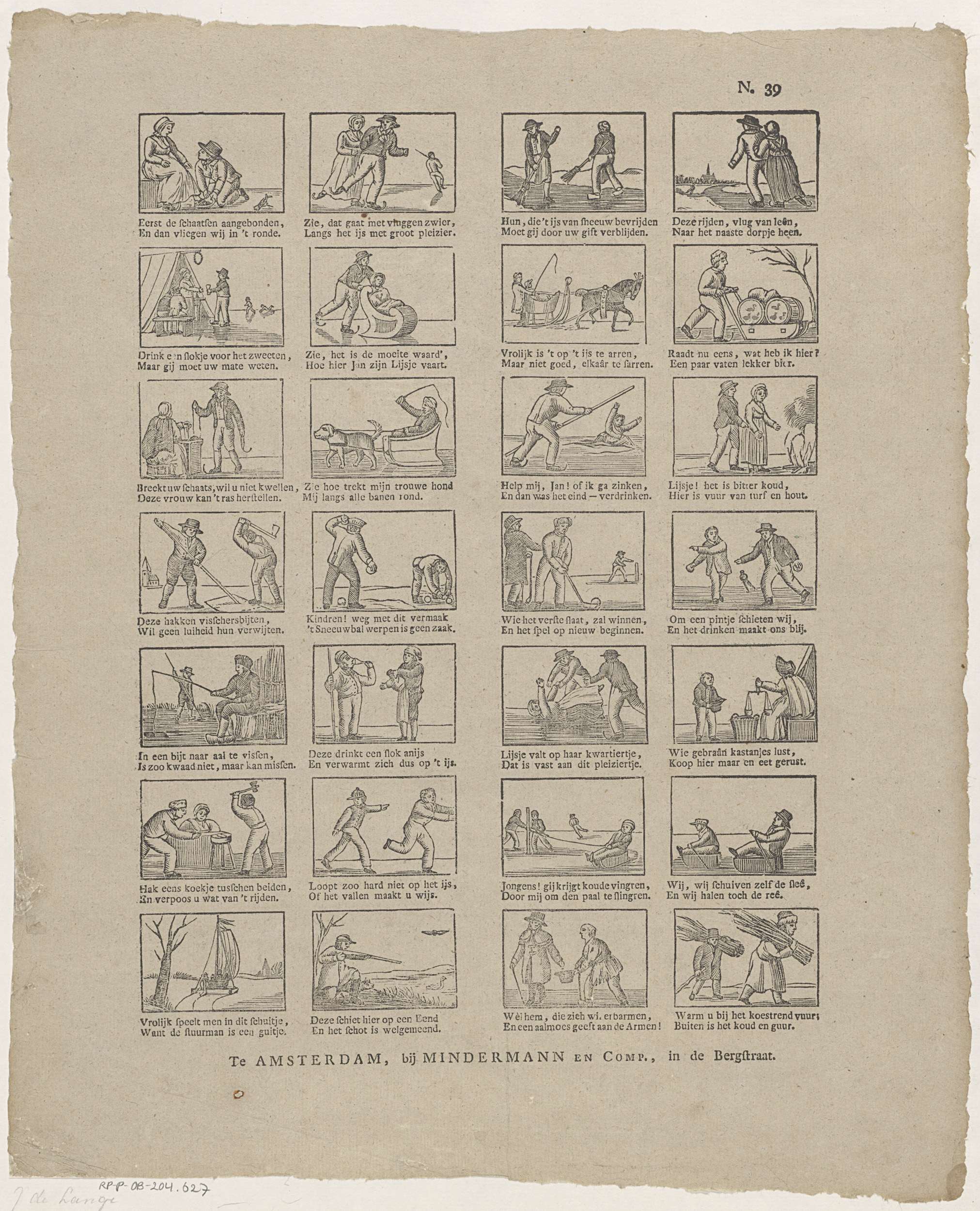 Blad met 28 voorstellingen van winterse taferelen, van onder andere mensen die schaatsen, sleeën en ijsvissen. Onder elke afbeelding een tweeregelig vers. Genummerd rechtsboven: N. 39.