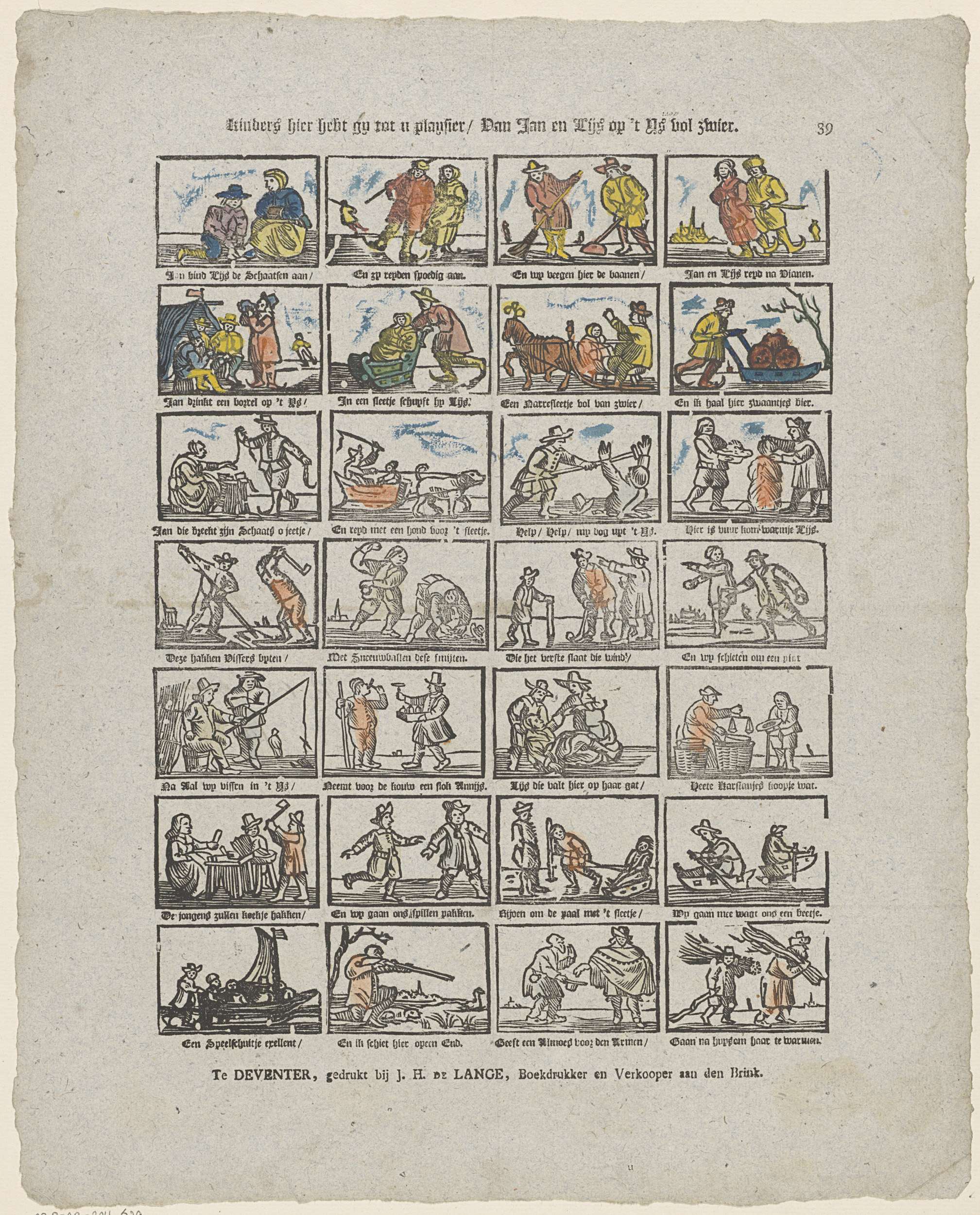 Blad met 28 voorstellingen van winterse taferelen, van onder andere mensen die schaatsen, sleeën en ijsvissen. Onder elke afbeelding een tweeregelig vers. Genummerd rechtsboven: 39.