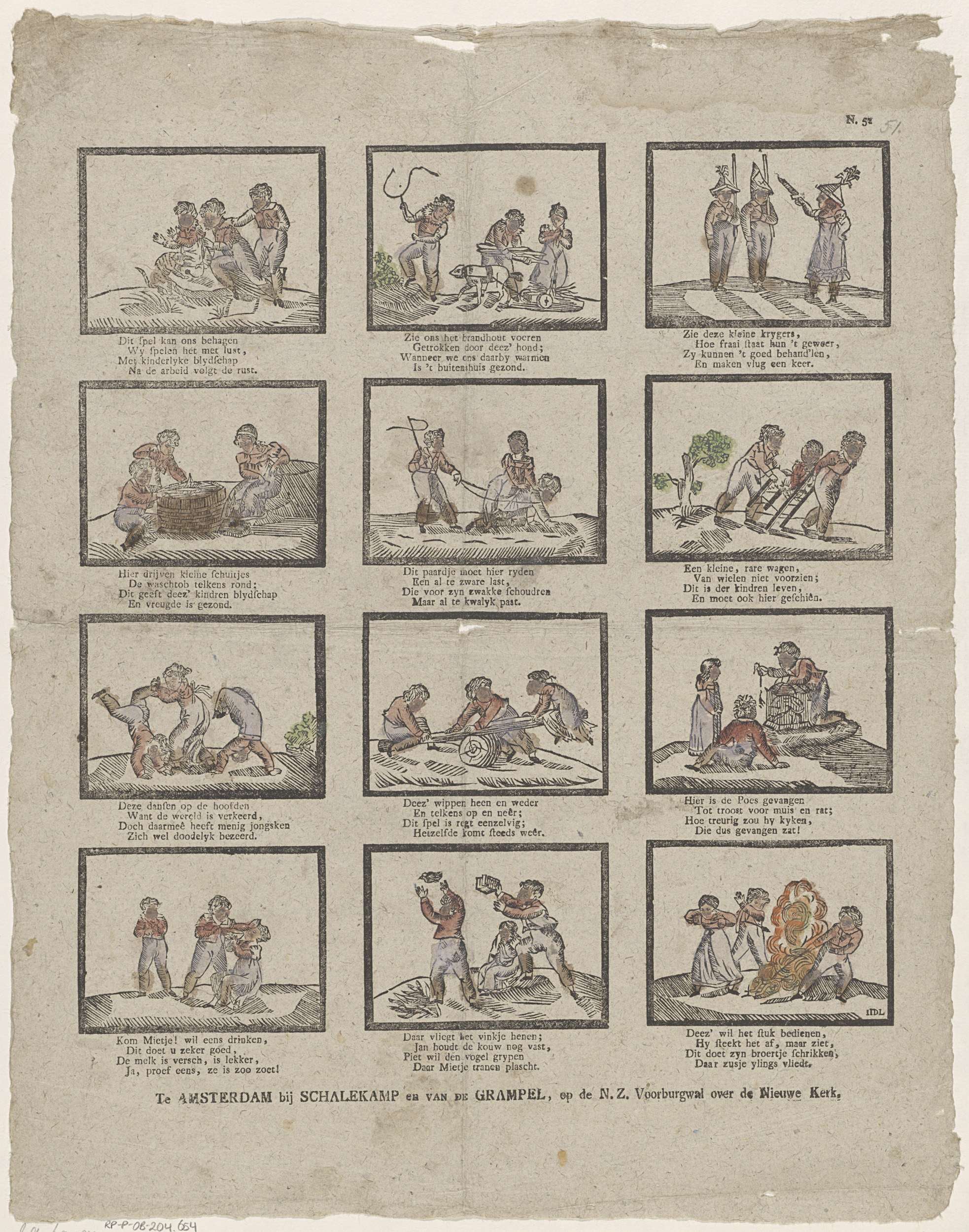 Blad met 12 voorstellingen van kinderspelen en bezigheden, zoals soldaatje spelen, wippen en vogels vangen. Onder elke afbeelding een vierregelig vers. Genummerd rechtsboven: N. 51.