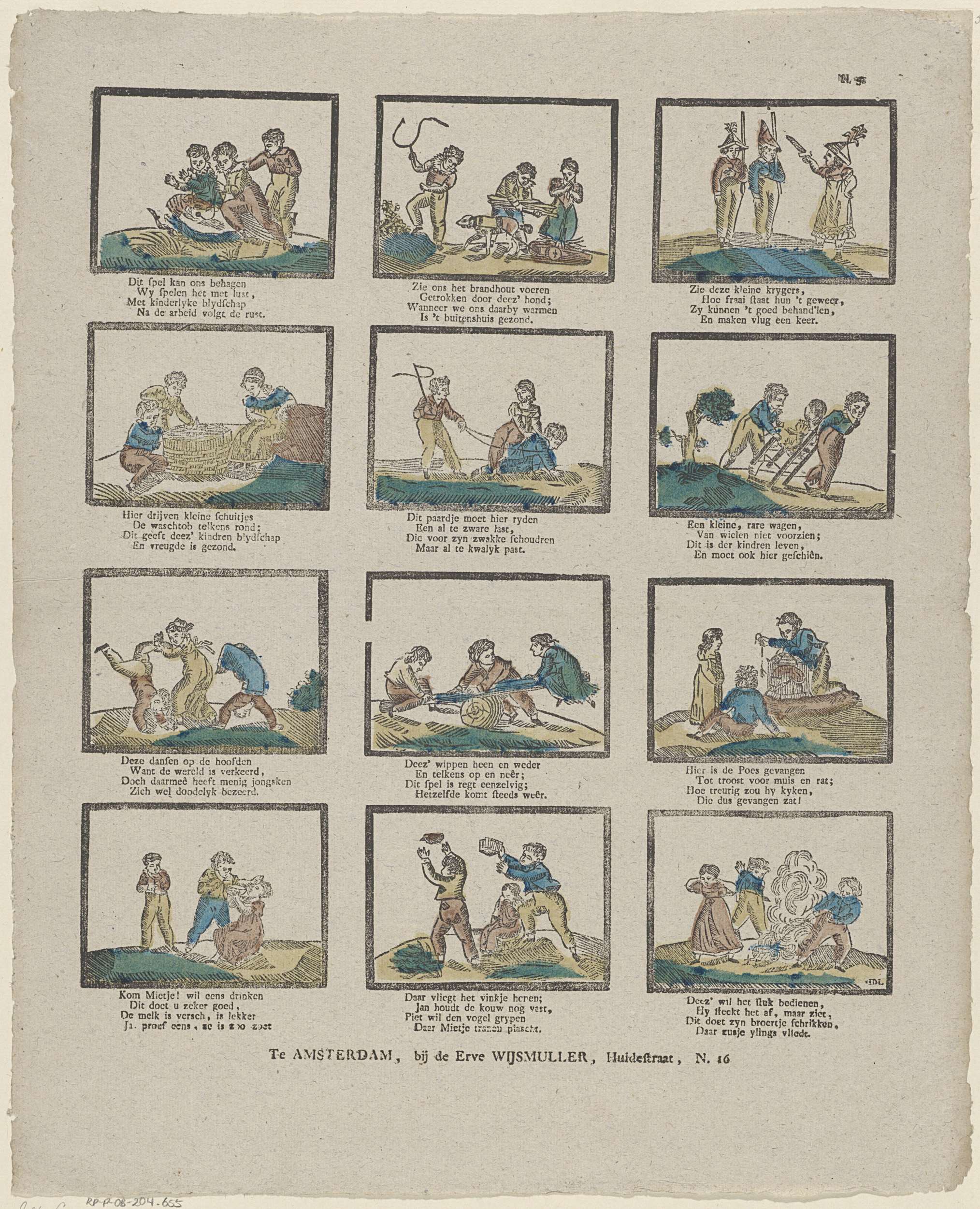 Blad met 12 voorstellingen van kinderspelen en bezigheden, zoals soldaatje spelen, wippen en vogels vangen. Onder elke afbeelding een vierregelig vers. Genummerd rechtsboven: N. 51.