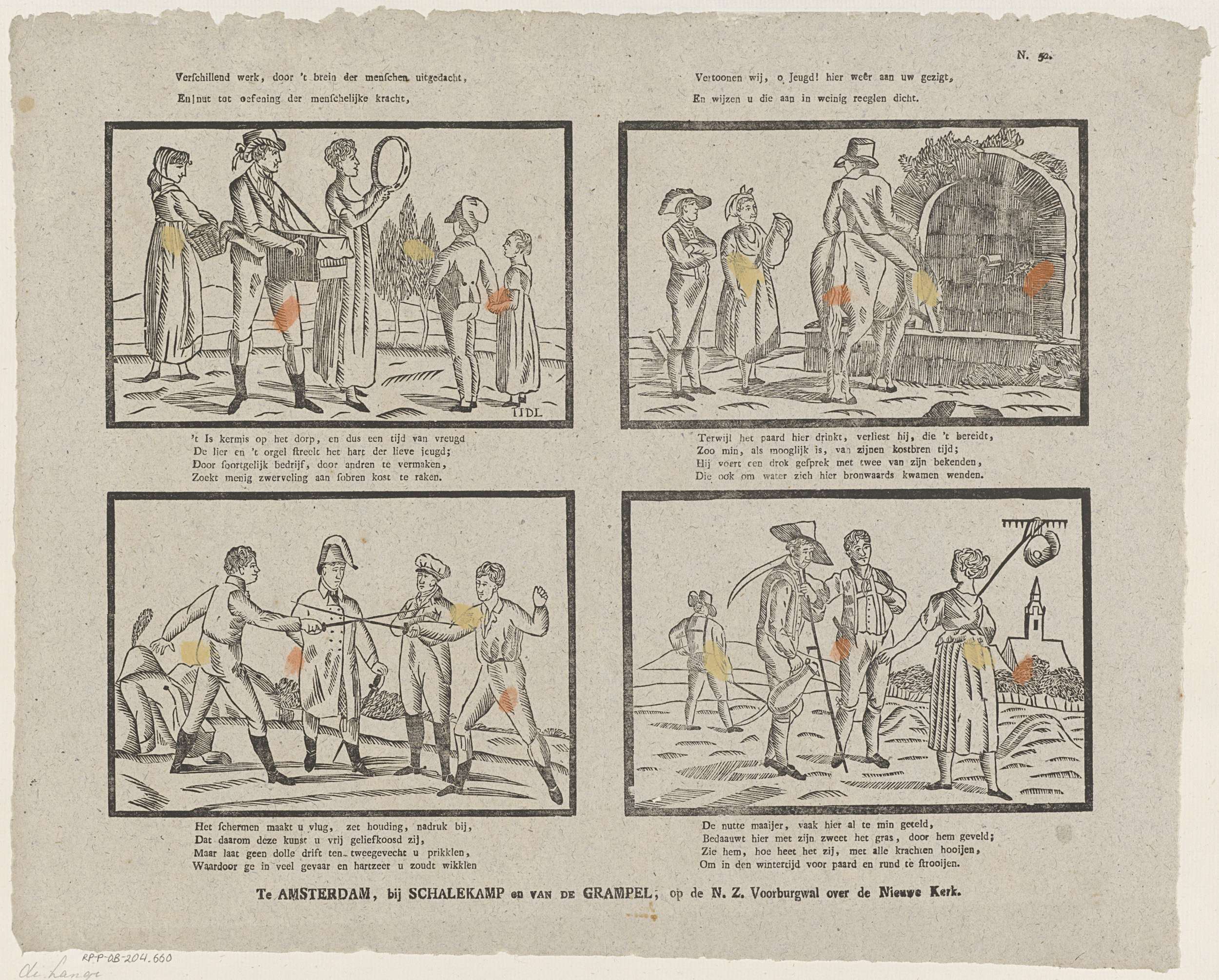 Blad met 4 voorstellingen van verschillende bezigheden, waaronder schermen en op het land werken. Onder elke voorstelling een vierregelig vers. Genummerd rechtsboven: N. 52.