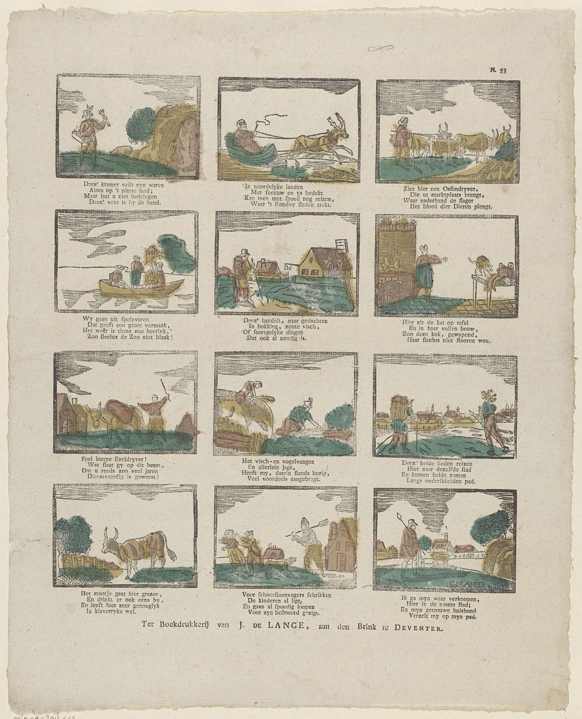Blad met 4 voorstellingen van verschillende figuren, beroepen en bezigheden. Onder elke voorstelling een vierregelig vers. Genummerd rechtsboven: N. 53.