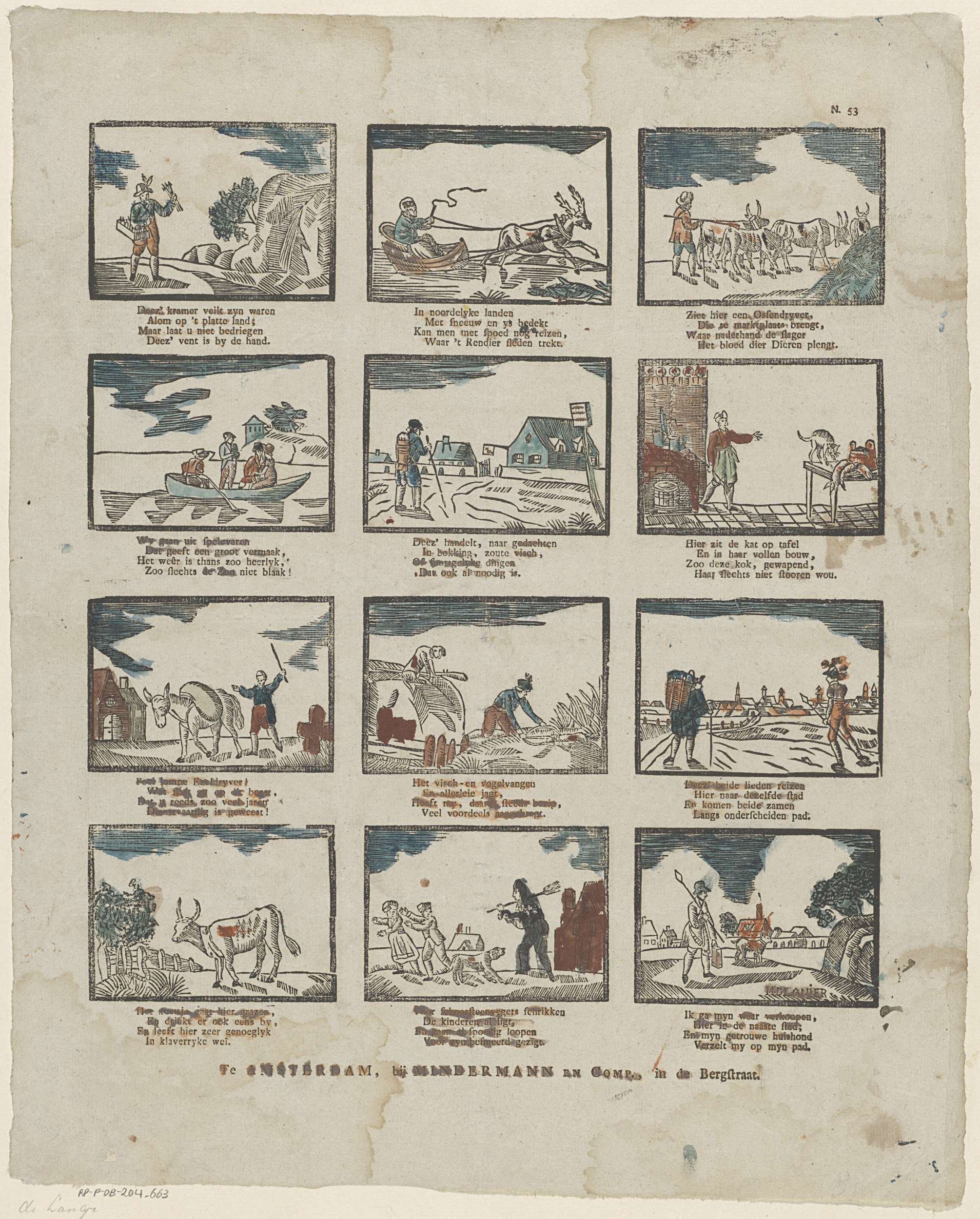 Blad met 4 voorstellingen van verschillende figuren, beroepen en bezigheden. Onder elke voorstelling een vierregelig vers. Genummerd rechtsboven: N. 53.