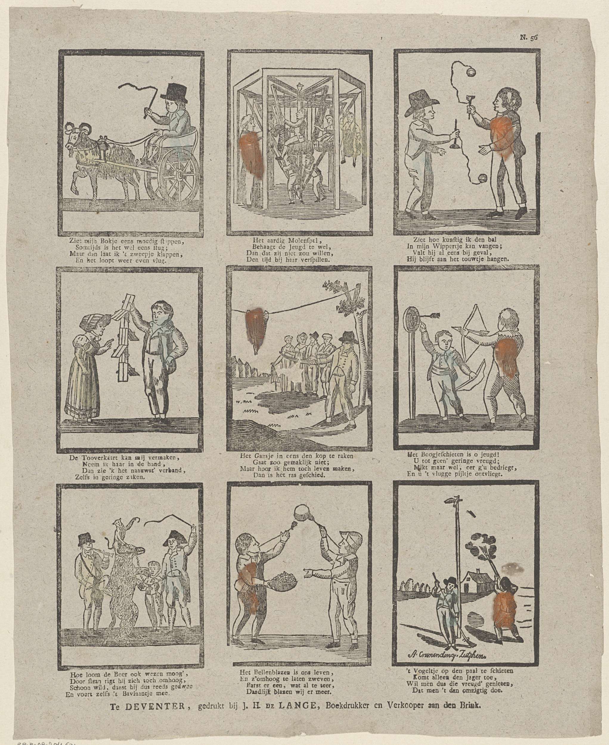 Blad met 12 voorstellingen van kinderspelen, zoals schieten met pijl-en-boog en bellenblazen. Onder elke voorstelling een vierregelig vers. Genummerd rechtsboven: N. 56.