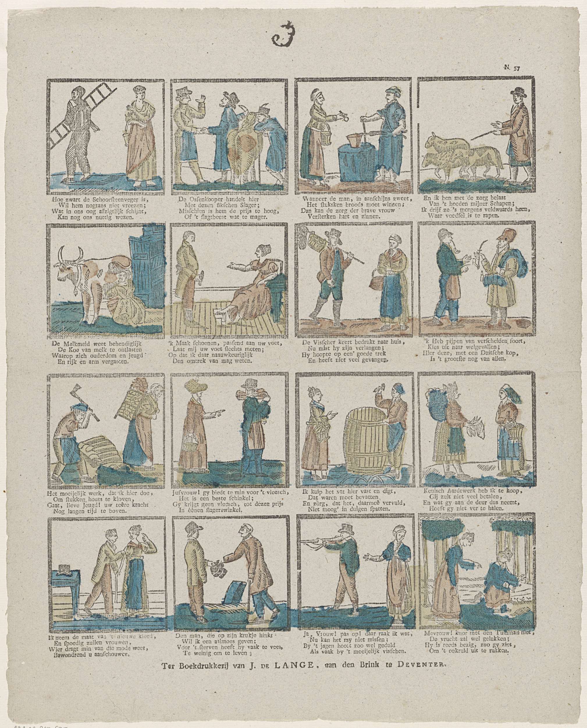 Blad met 16 voorstellingen van ambachtslieden en beroepen, zoals schoorsteenveger, melkmeid, schoenmaker en kleermaker. Onder elke voorstelling een vierregelig vers. Genummerd rechtsboven: N. 57.