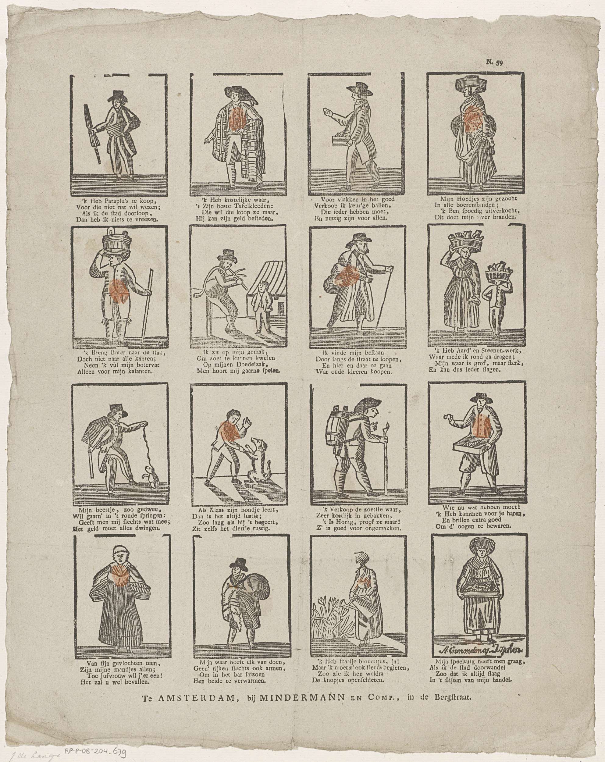 Blad met 16 voorstellingen van figuren en beroepen, zoals een straatverkoper, een doedelzakspeler en een vrouw die de planten water geeft. Onder elke afbeelding een vierregelig vers. Genummerd rechtsboven: N 59.