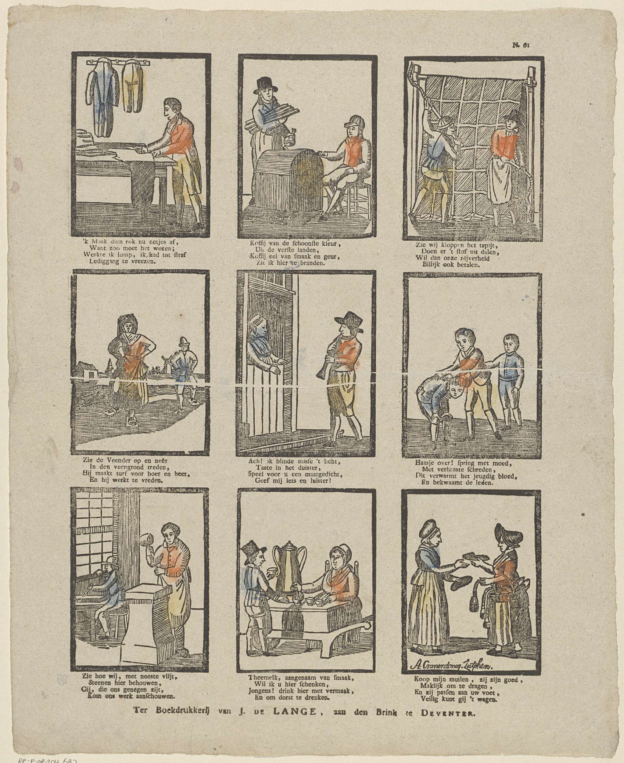 Blad met 9 voorstellingen van ambachtslieden en beroepen, zoals kleermaker, mattenklopper en straatverkoper. Onder elke afbeelding een vierregelig vers. Genummerd rechtsboven: N. 61.